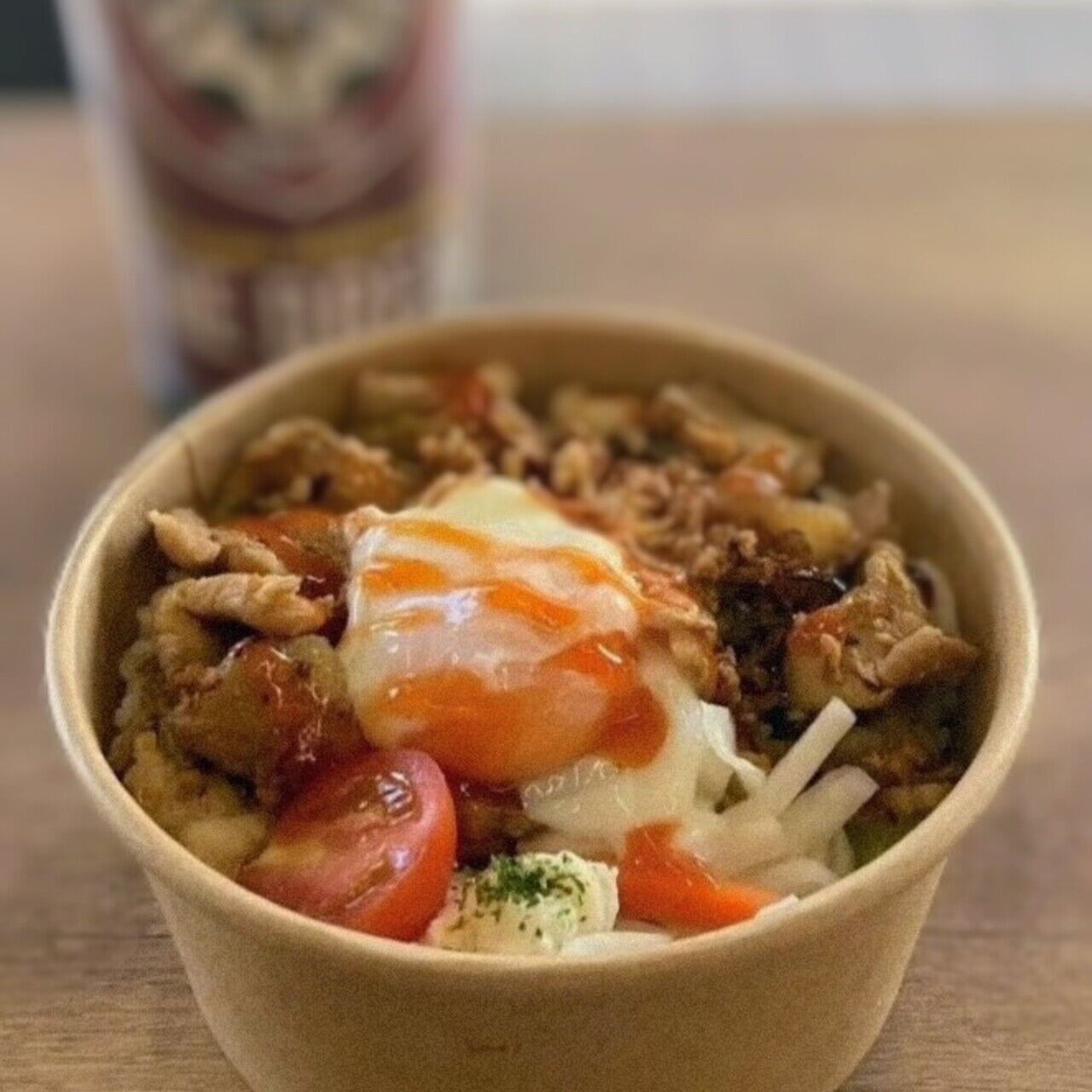 バインミーの具だったポークをオンザライスで🍚 温玉無料! フライドオニオン、フライドガーリックトッピングが選べます。