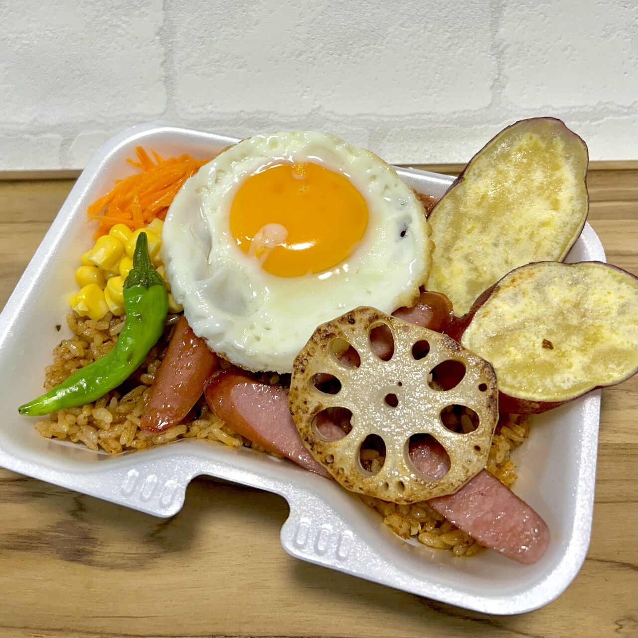 季節の野菜を乗せたジャンバラヤです。現在はさつまいもとレンコン。