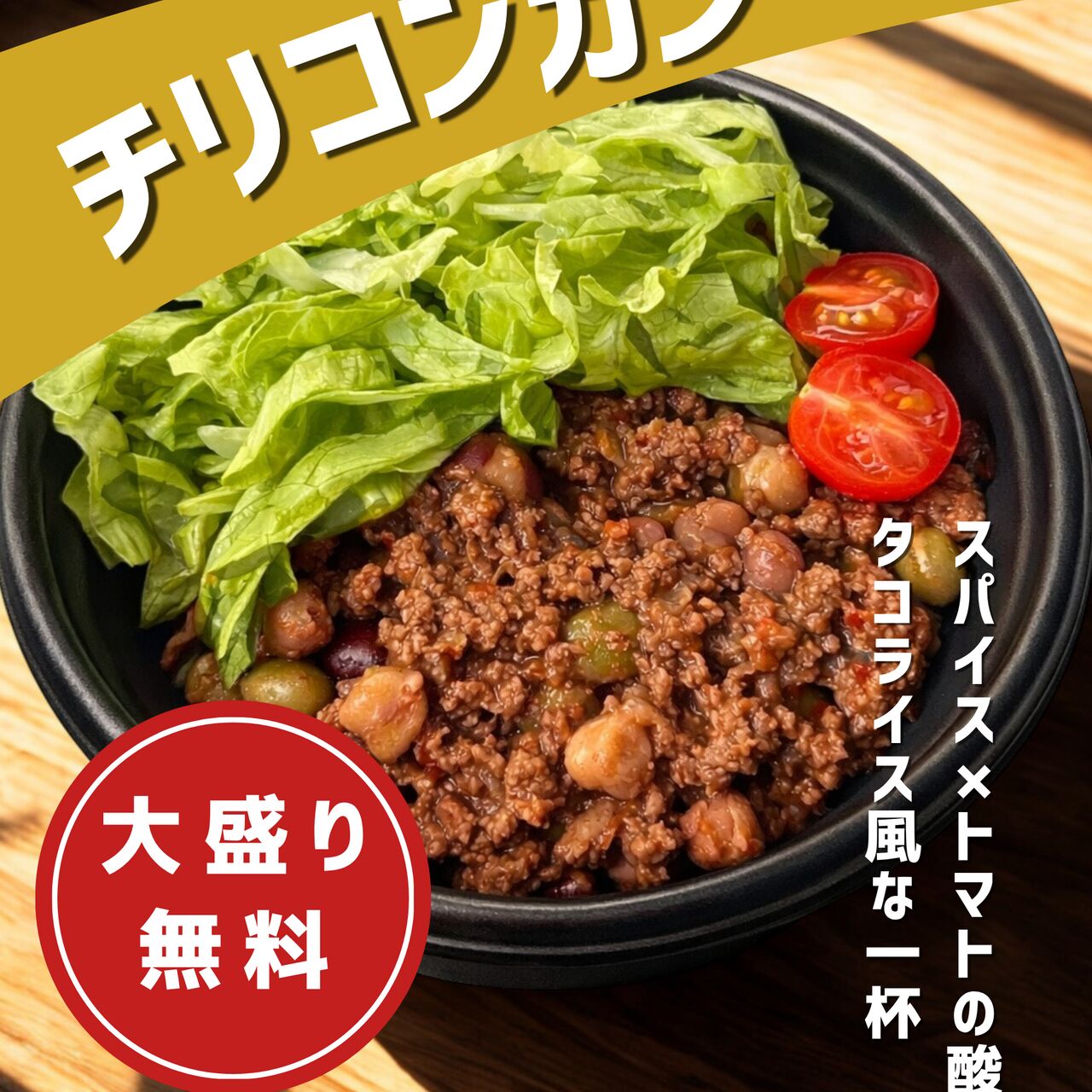 ひき肉・たまねぎを炒め、そこにいんげん豆、トマト、チリパウダーなどの香辛料を加えて煮込んだチリコンカンをご飯の上に!タコライス風な味わいが楽しめます!