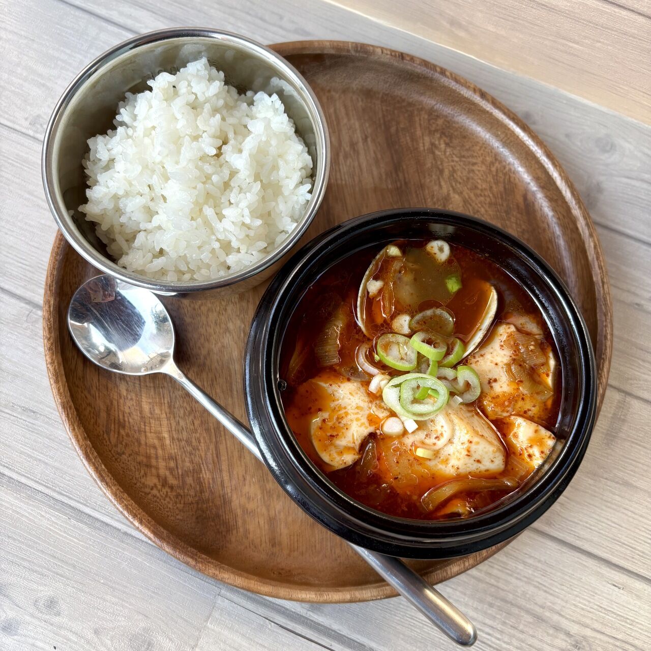 やわらかい豆腐と特製旨辛スープの熱々チゲ。海鮮の旨みたっぷりです!ライス付きです。