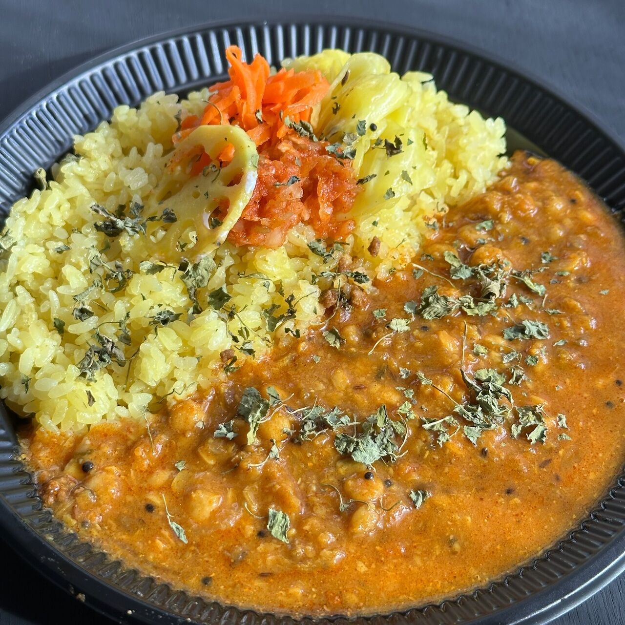 ひきわり豆や野菜を使ったその日の豆カレーです。滋味深い味で、お肉がなくてもスパイスの風味で満足感があります。