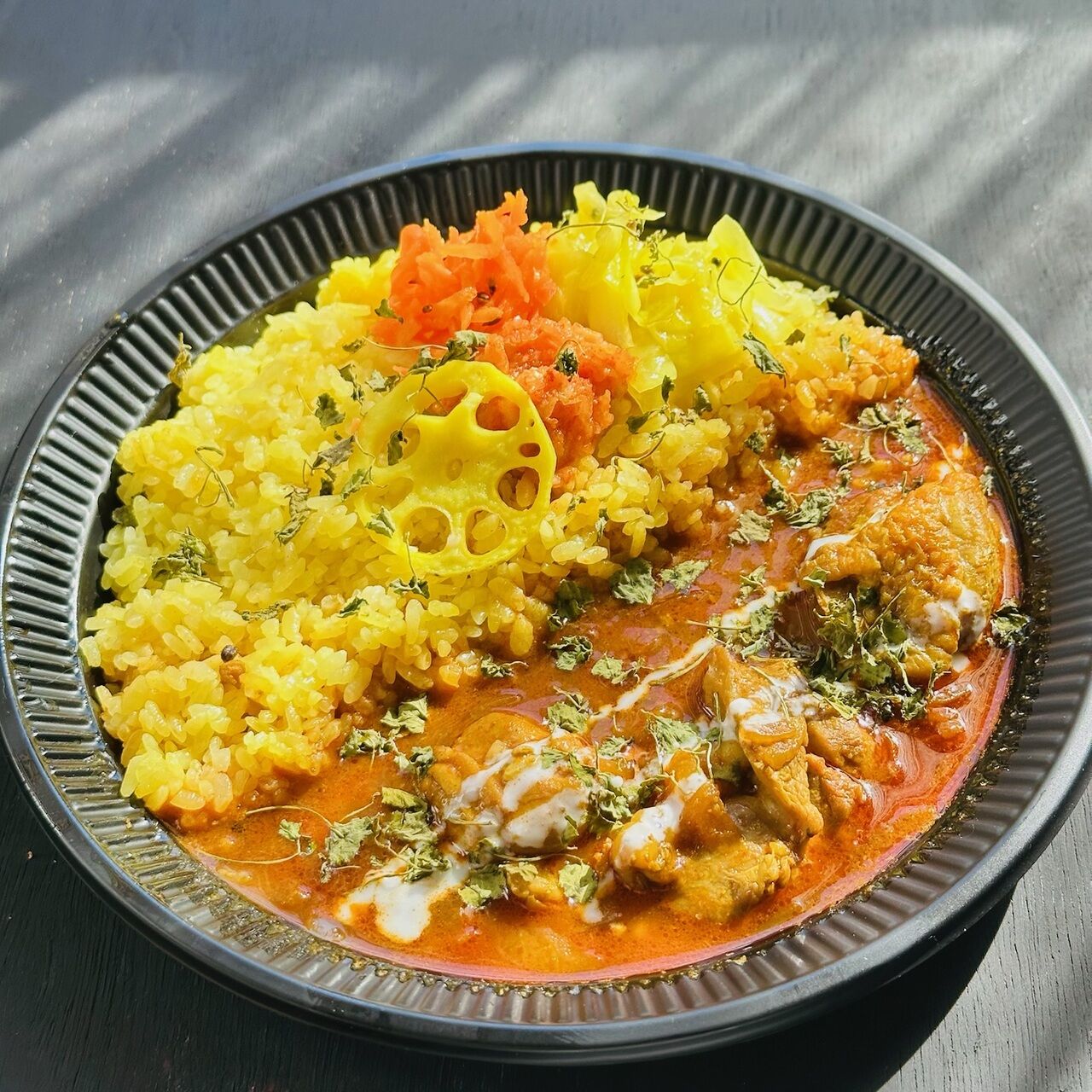 本日のチキンカレー(写真は一例です、副菜は随時変わります。仕入れ状況によりご提供が無い日もあります)