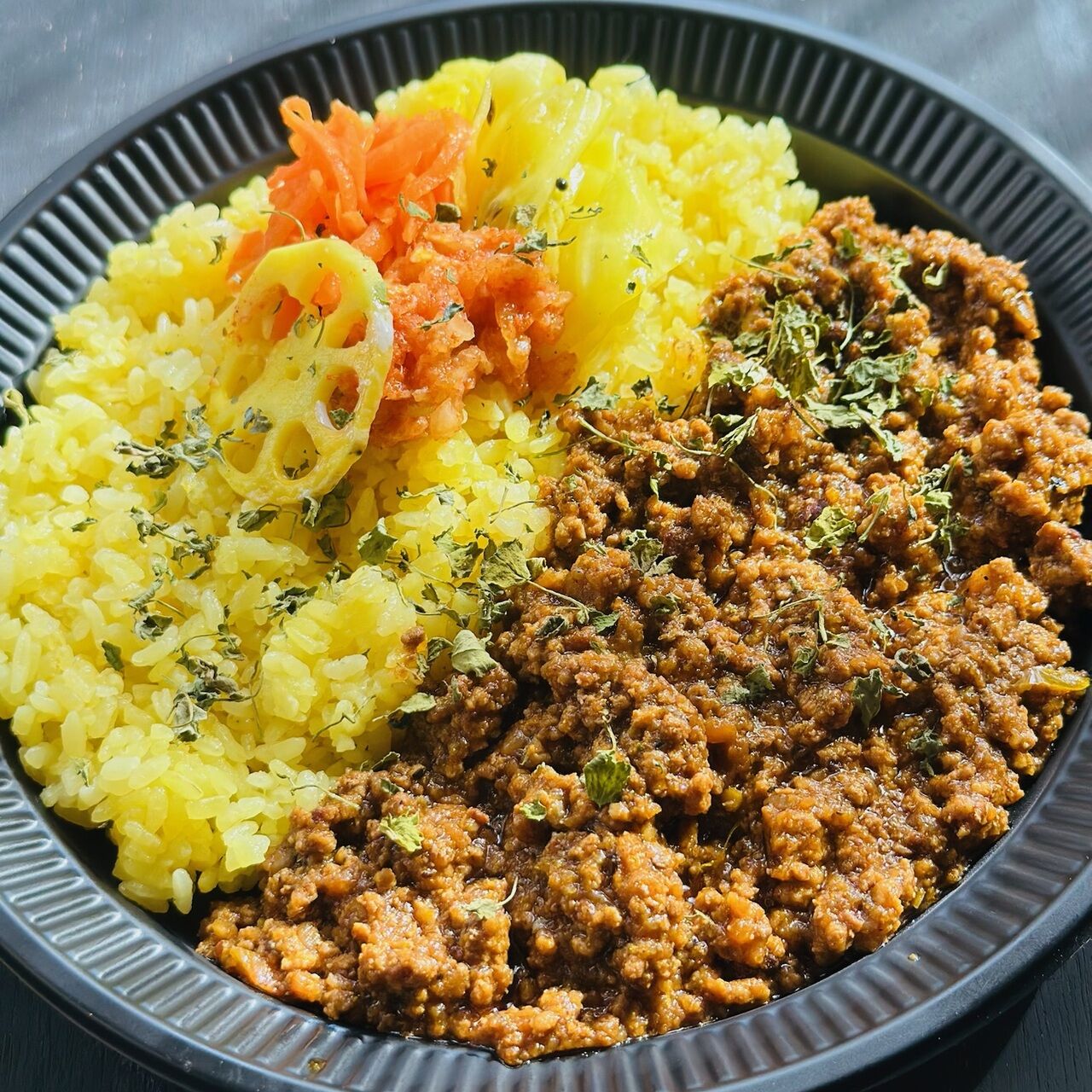 本日のキーマカレー(写真は一例です、副菜は随時変わります。仕入れ状況によりご提供が無い日もあります)