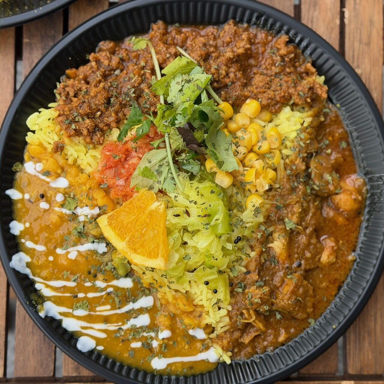 トリプルハーフ(盛り付けは一例です。副菜は随時が終わります。組み合わせにより値段は変動します。3種類カレーがない日はご提供のない日もあります。)