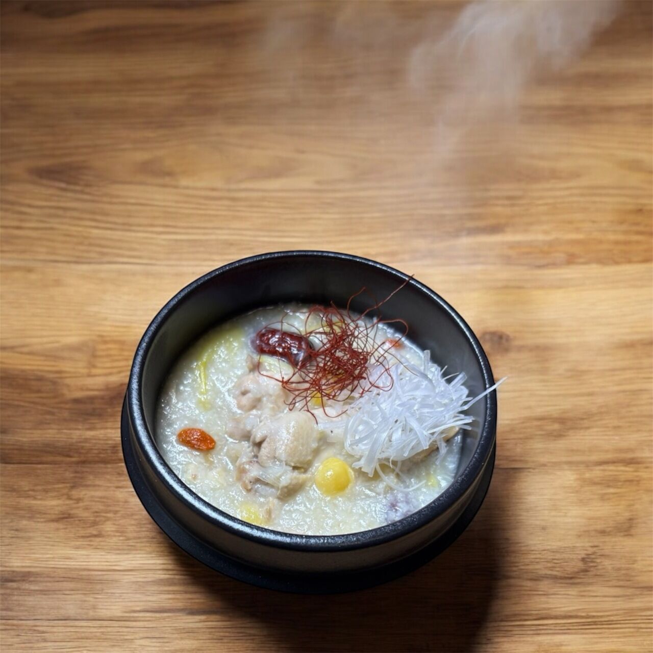 高麗人参をはじめとした9種類の生薬で煮込んだ鶏肉の薬膳スープ粥です。素材と塩味のみの無添加で優しいお味です。身体が芯から温まりますよ。