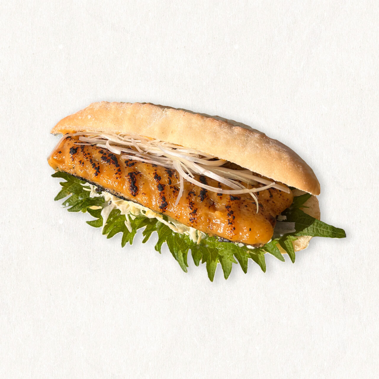 八角を効かせた甘味噌をかけ、バーナーで 焦がして香ばしく仕上げた和風サバサンド。 大葉とコールスローの相性がバッチリ!