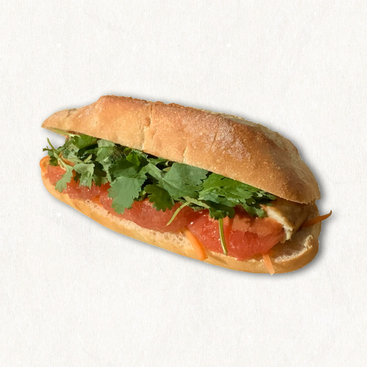 なますやサバのリエットを挟んだバインミー風! ピンクグレープフルーツ入りでココナッツトマトソースをかけたフルーティなサバサンドです。