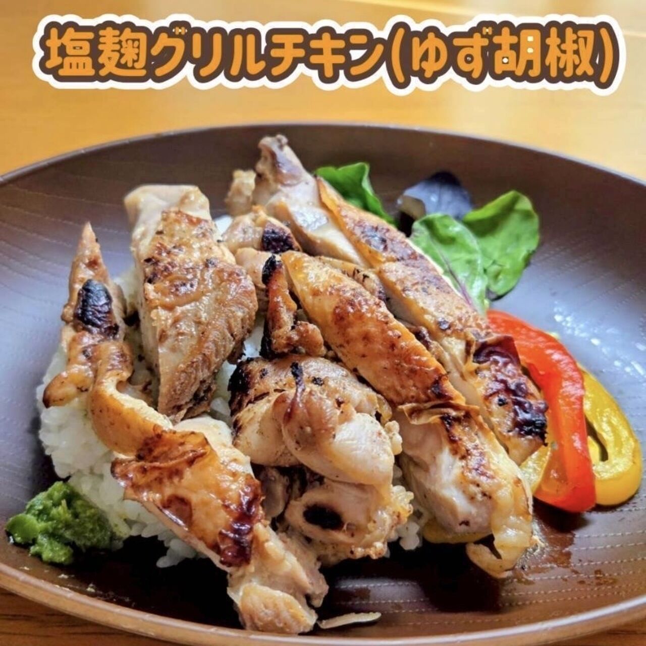 塩麹に漬けて柔らかくなったチキンを焼きました。数量限定の"生"柚子胡椒を添えて。