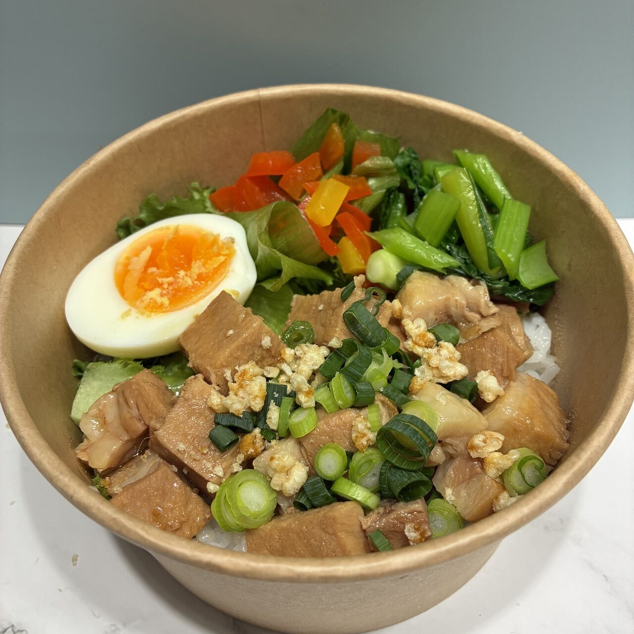 とろとろに煮込んだ豚の角煮に色とりどりの野菜を添えました