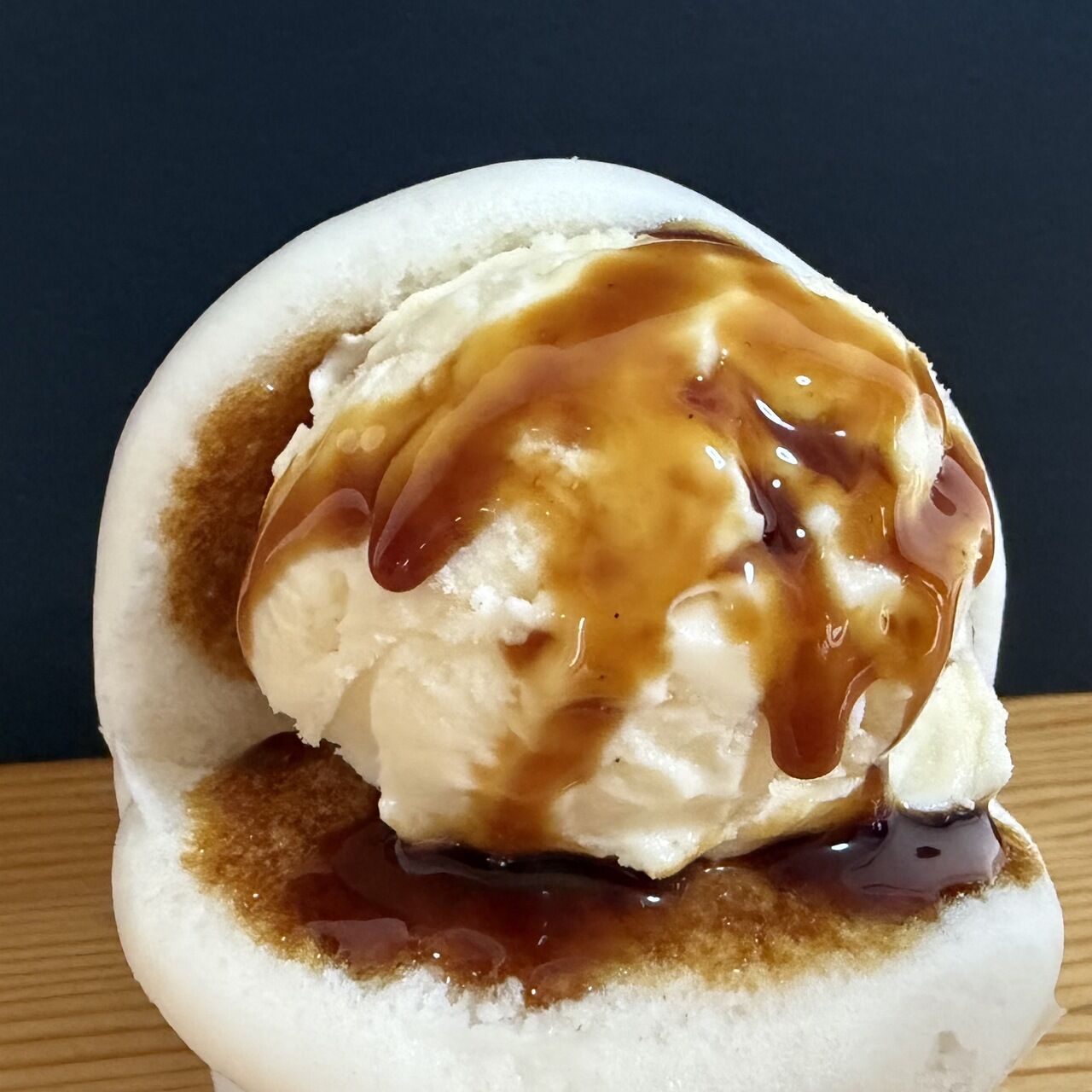 中華まんの皮に醤油アイスを挟みました。まるでみたらし団子!?のような味わいです。