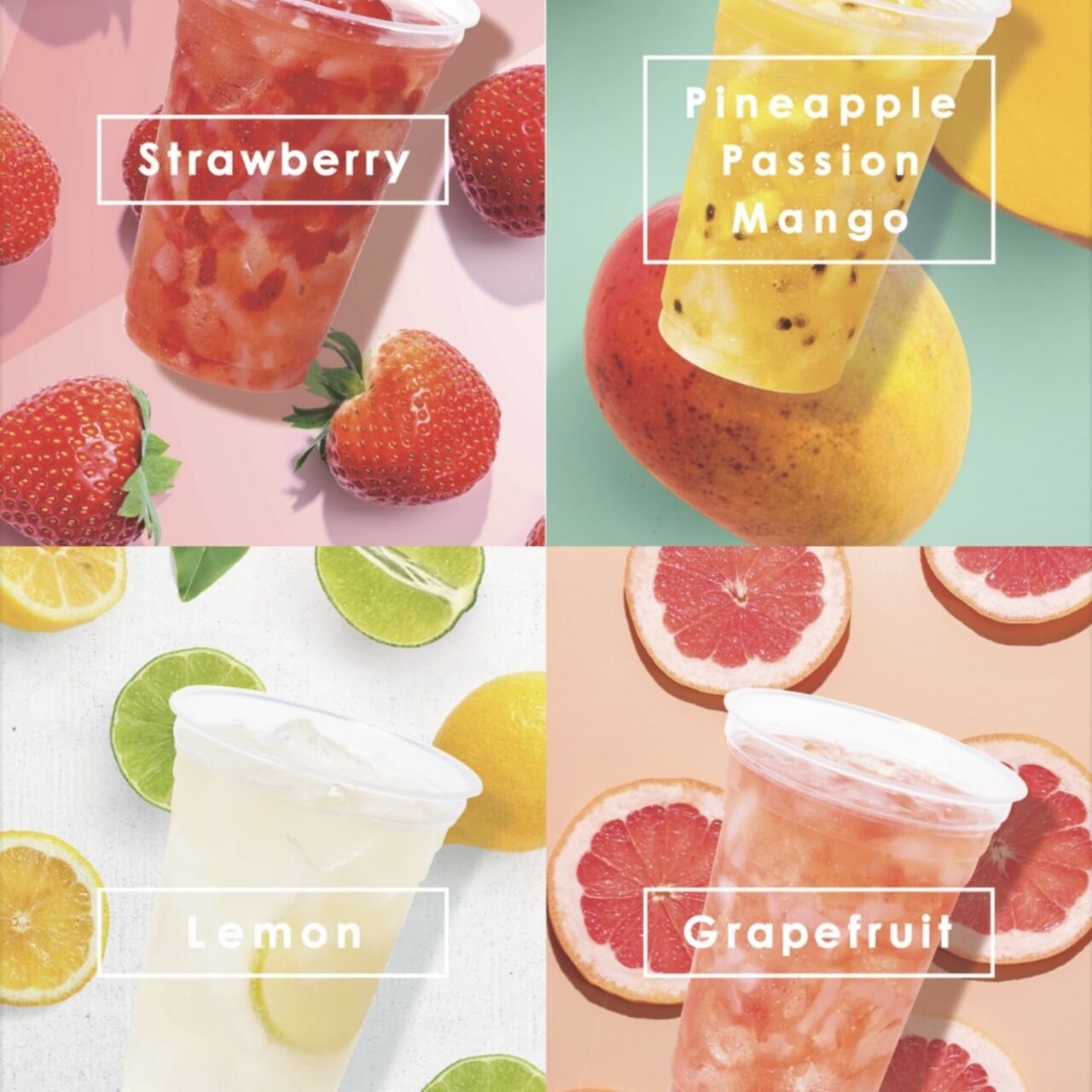 ナタデココが入ったフルーツソーダ。(ストロベリー・グレープフルーツ・台湾レモン・パイン&パッションフルーツ)