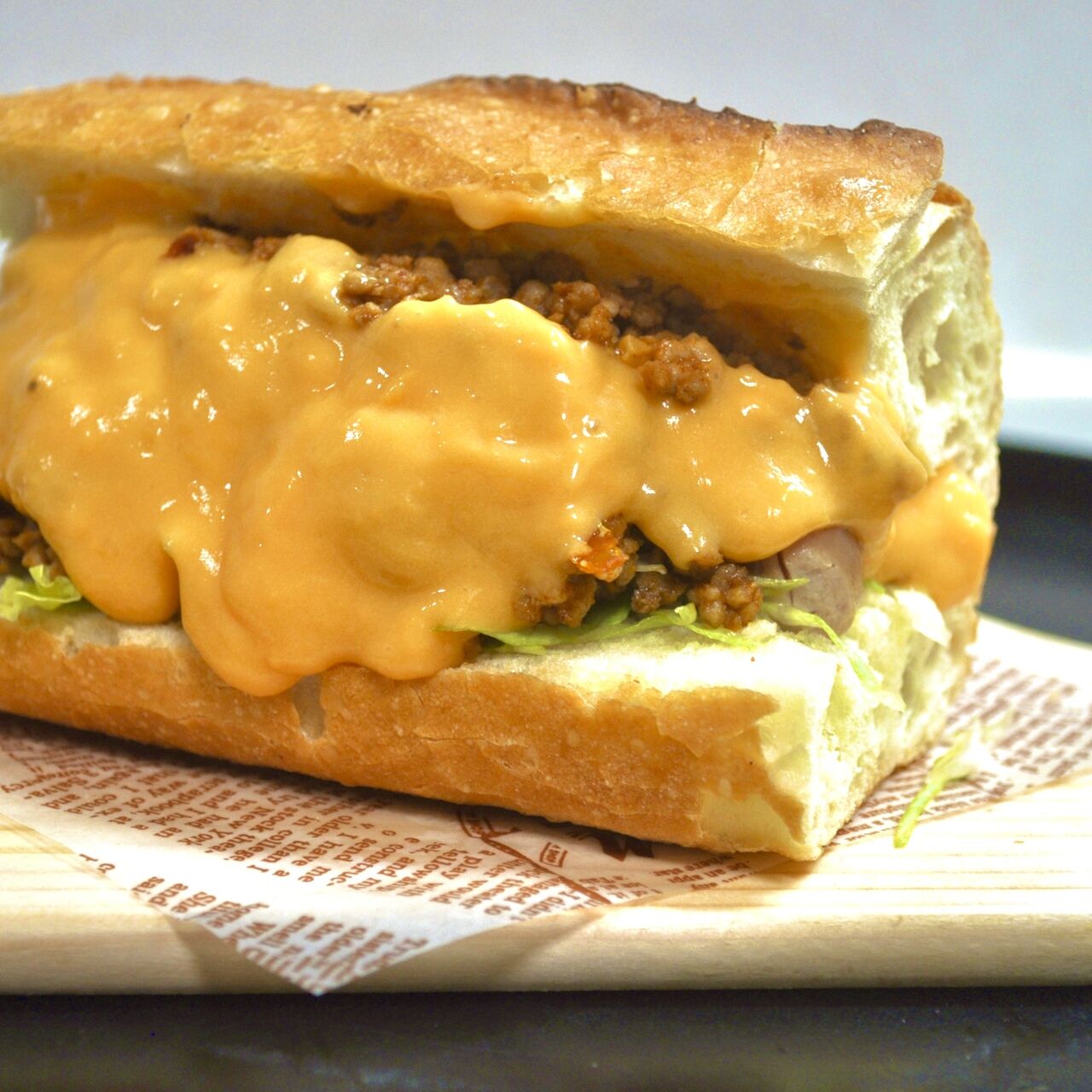 スパイスの効いたチリミートとチーズソースをたっぷり乗せたホットドッグ。