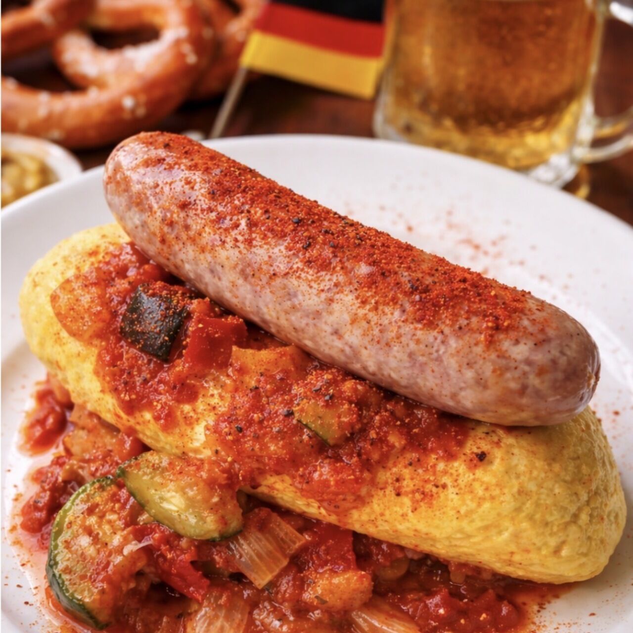 【国】ドイツのソウルフードをオムライスに。低温調理ソーセージとスパイス香るトマトソース。