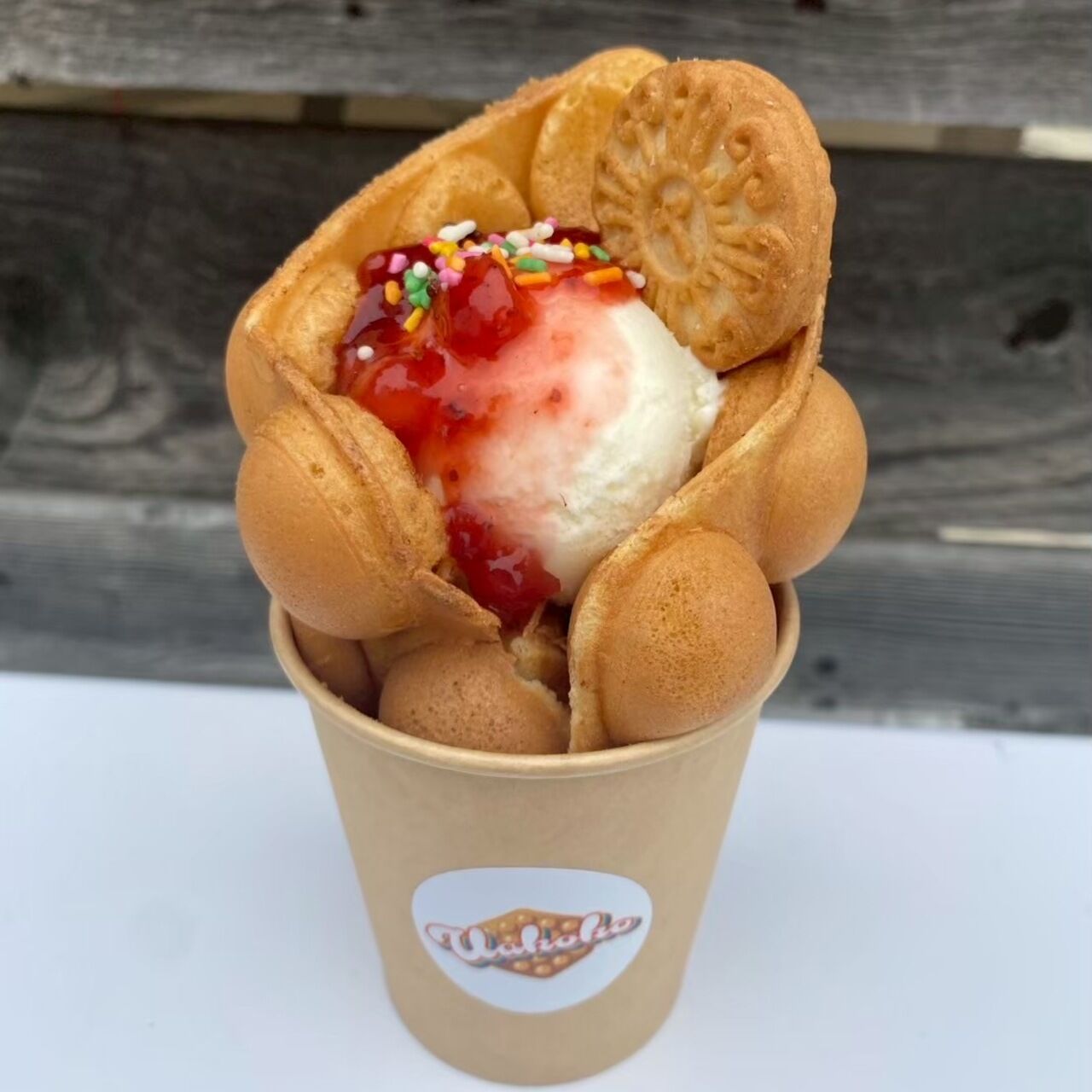 ぽこぽこした形が可愛い球状のワッフルです♪ サクサクモチモチ、、 時間が経つとフワフワに★ 通常メニュー4種+季節限定メニュー有り