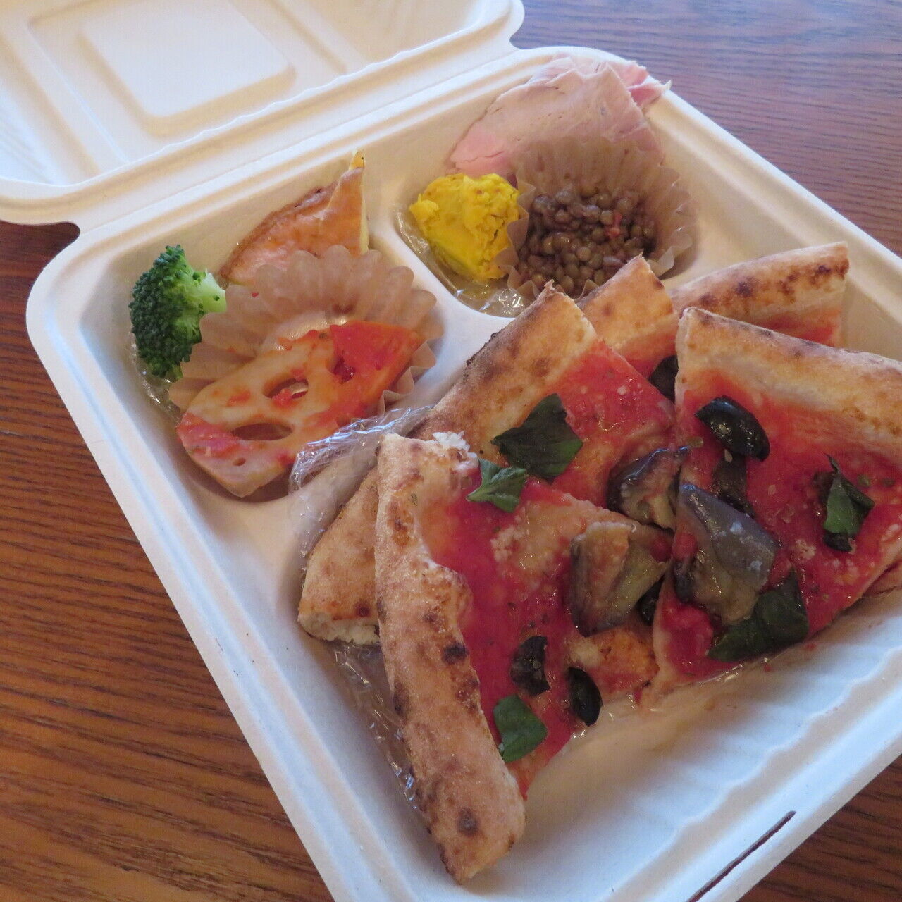 ナスとオリーブのトマトソースピッツァ!6種の前菜付きのお弁当です。