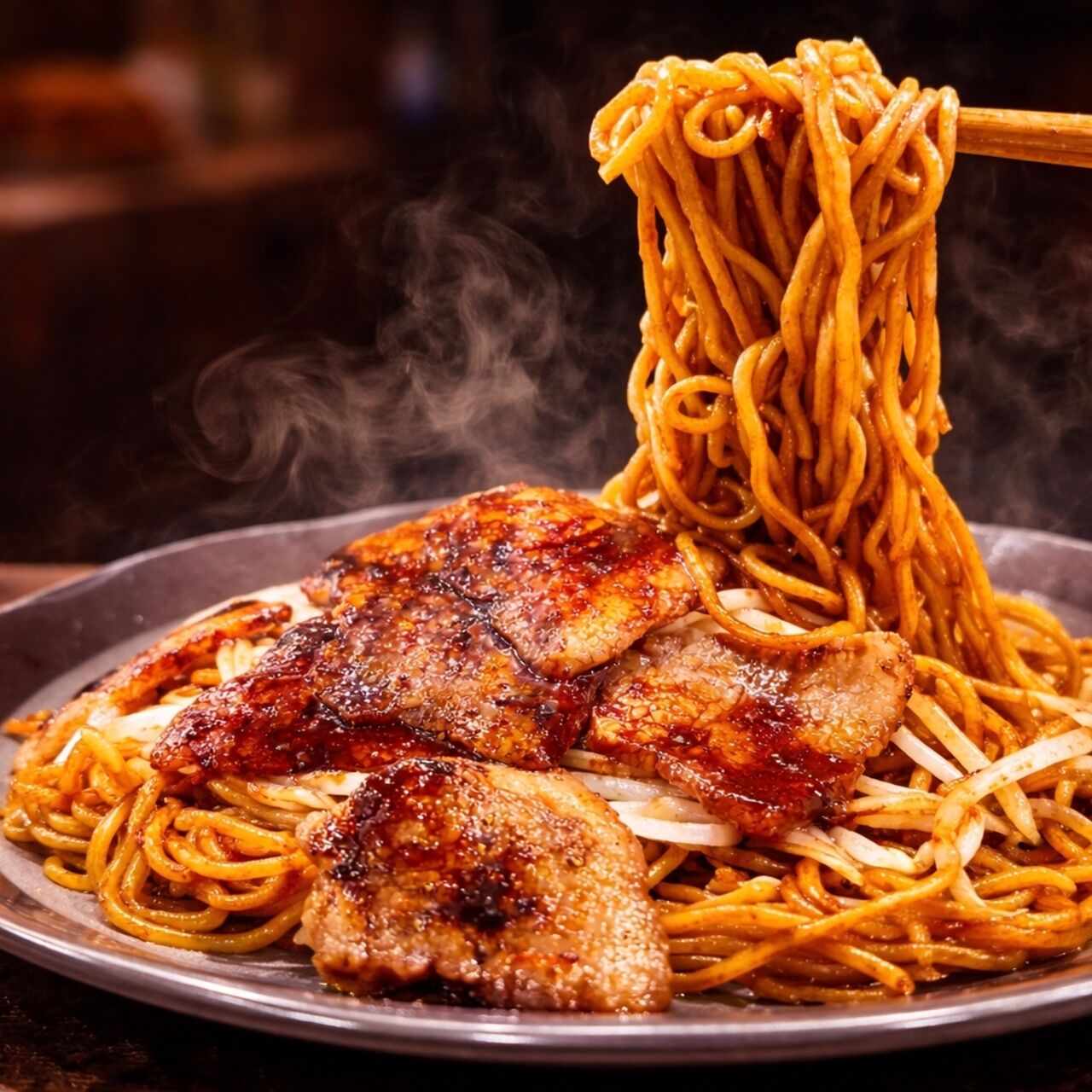 今話題の岐阜県飛騨地方のブランド豚【飛騨豚】を使用した焼きそば。にんにくの効いたスタミナ味です