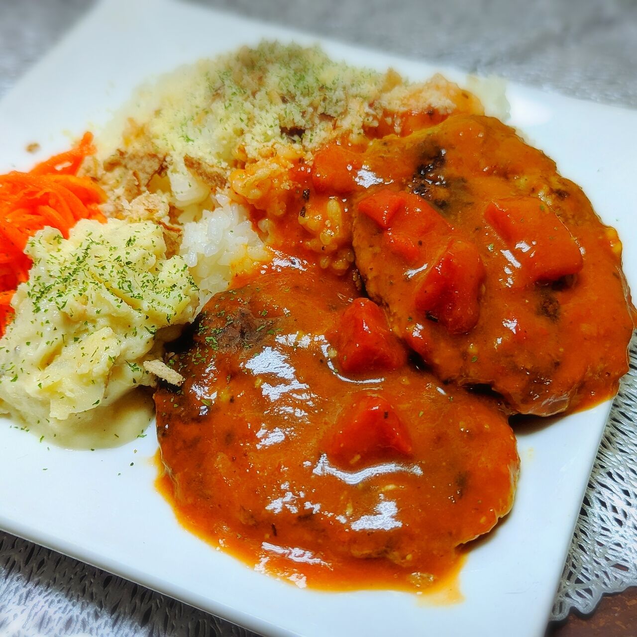 ふんわりしたジューシーなハンバーグとトマトの酸味、ガーリックの効いたトマトソースで煮込んだ一品。(冬季はデミトマトソースで煮込んでいます。)サラダ、ライス付き