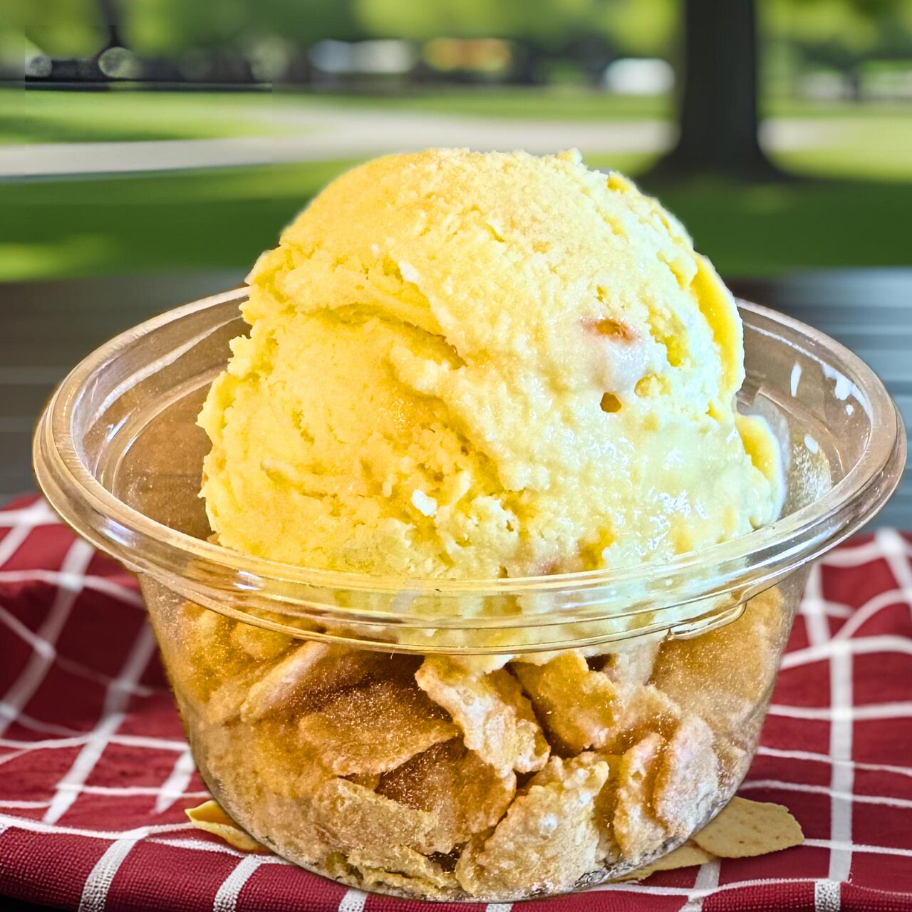 カナダ産メープルと ふわふわミルクホイップを お選びいただいたアイスクリーム にのせて底にサクサク甘い コーンフレークを入れた こだわりのサンデーです。
