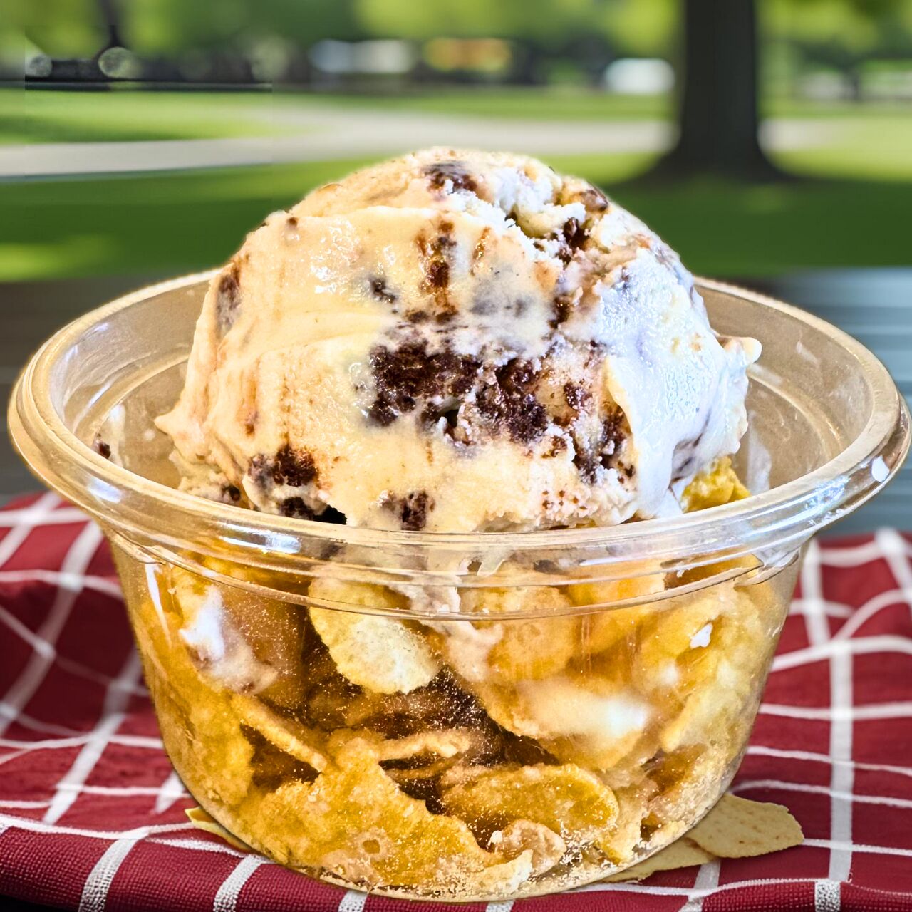 カナダ産メープルと ふわふわミルクホイップを お選びいただいたアイスクリーム にのせて底にサクサク甘い コーンフレークを入れた こだわりのサンデーです。