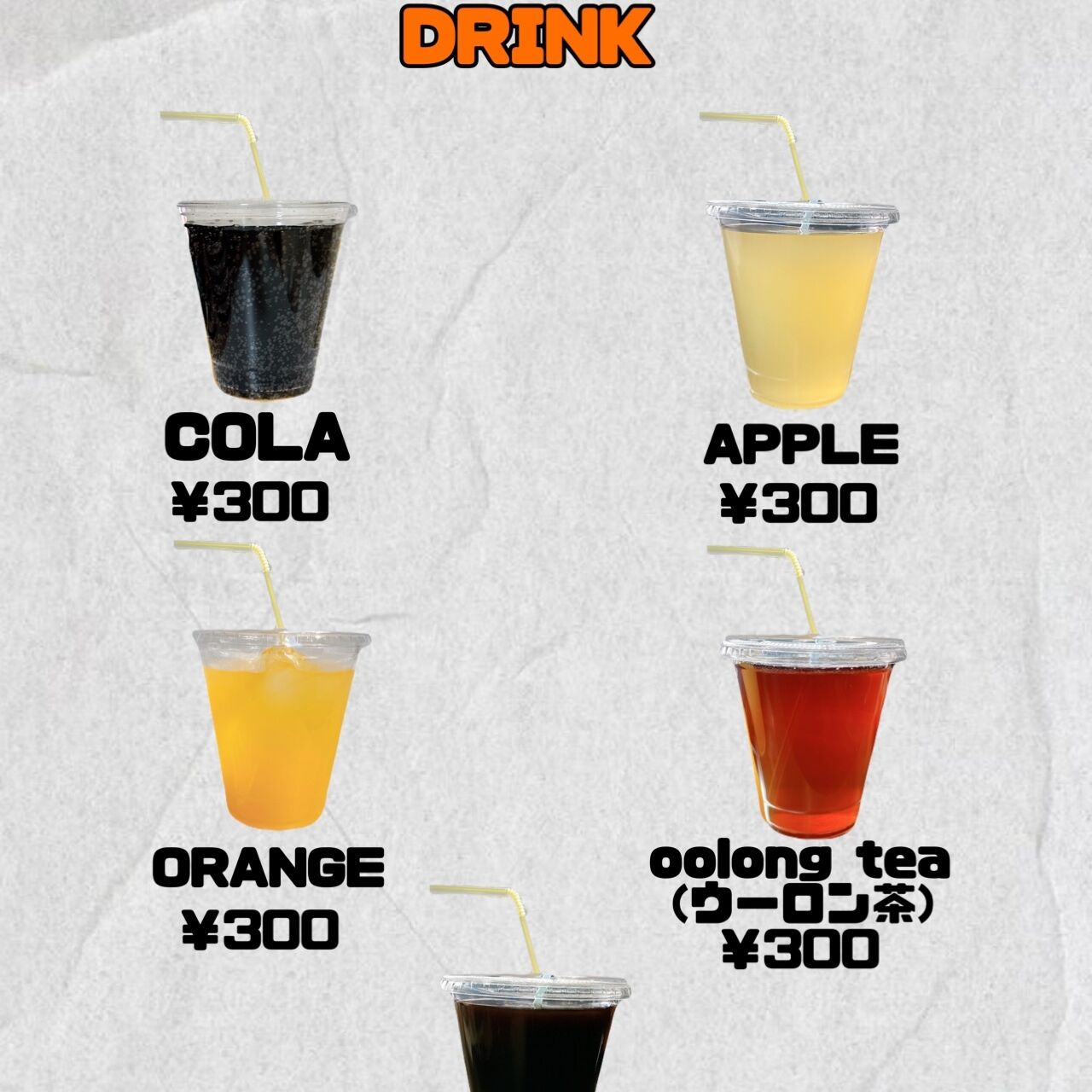 コーラ、アップル、オレンジ、ウーロン茶、コーヒー