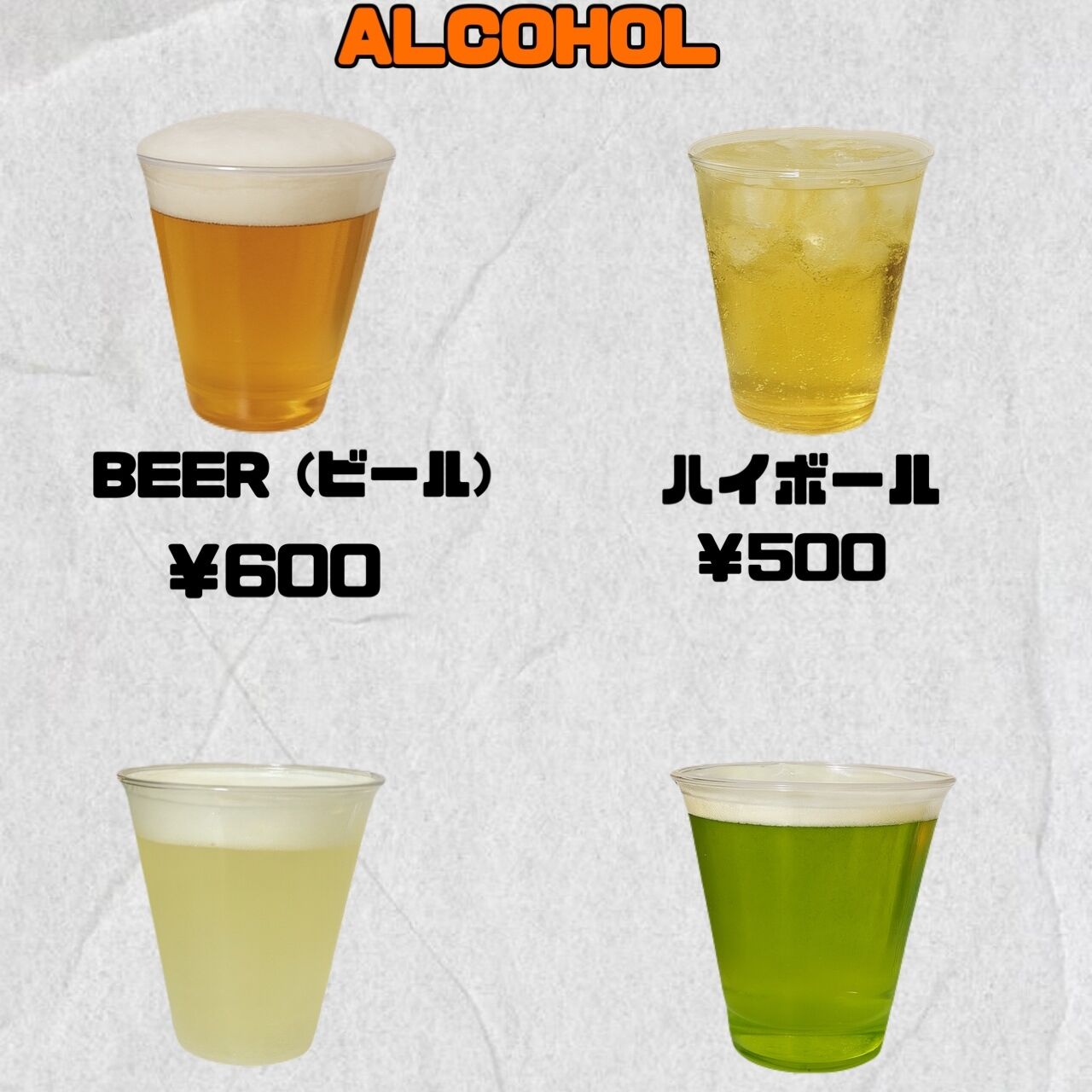 ビール、レモンサワー、ハイボール、緑茶ハイ