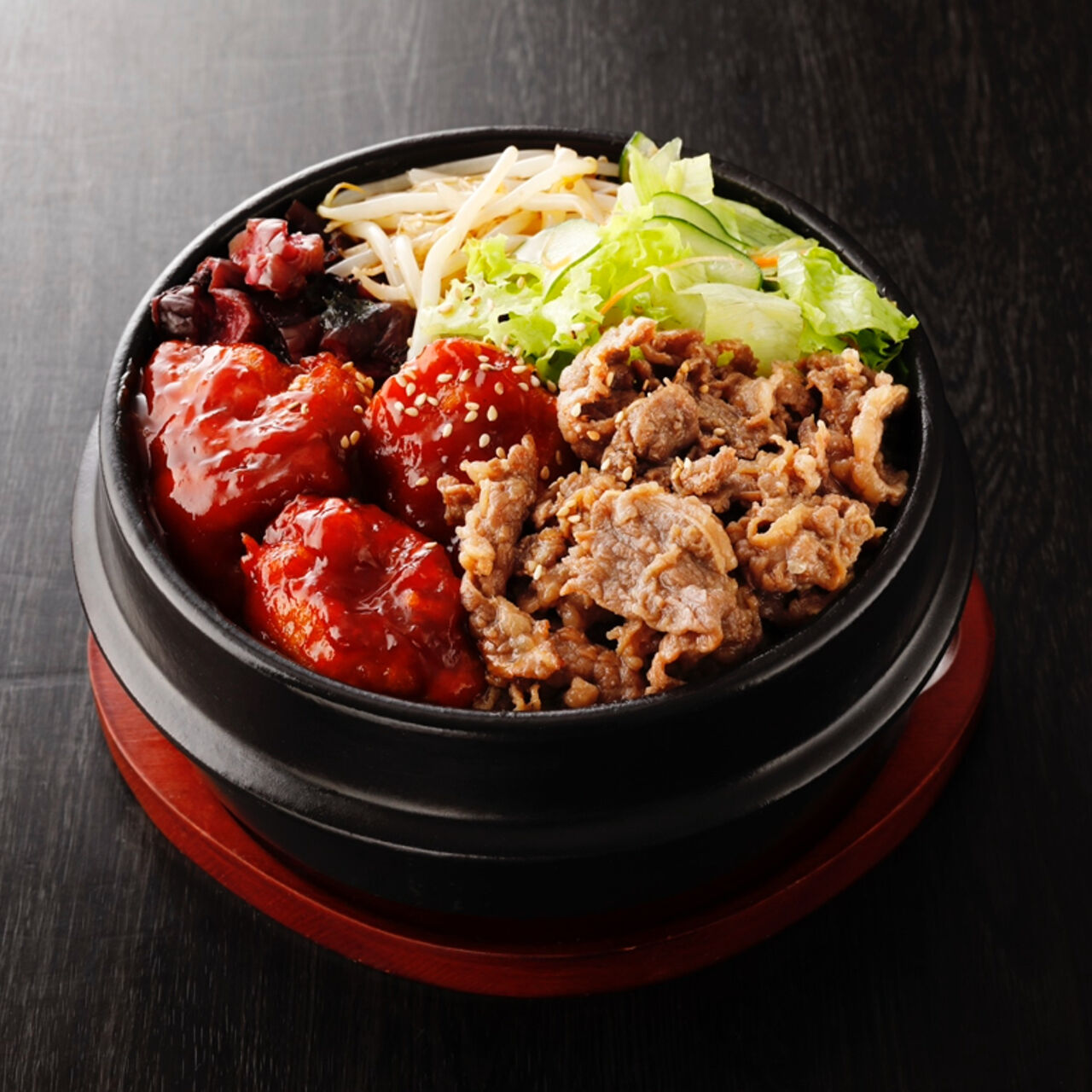 自家製マッ醤油で丁寧に仕上げた牛プルコギにヤンニョムチキン4ピース+自家製ナムルとお漬物が加わっボリューミーなお弁当になります。