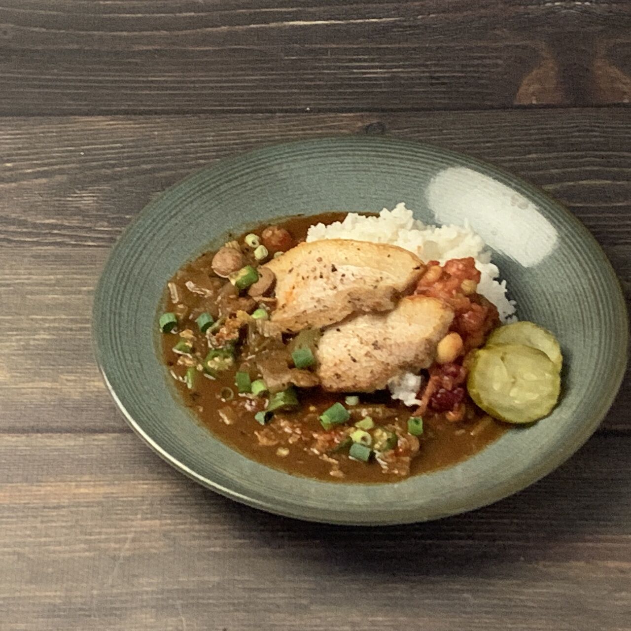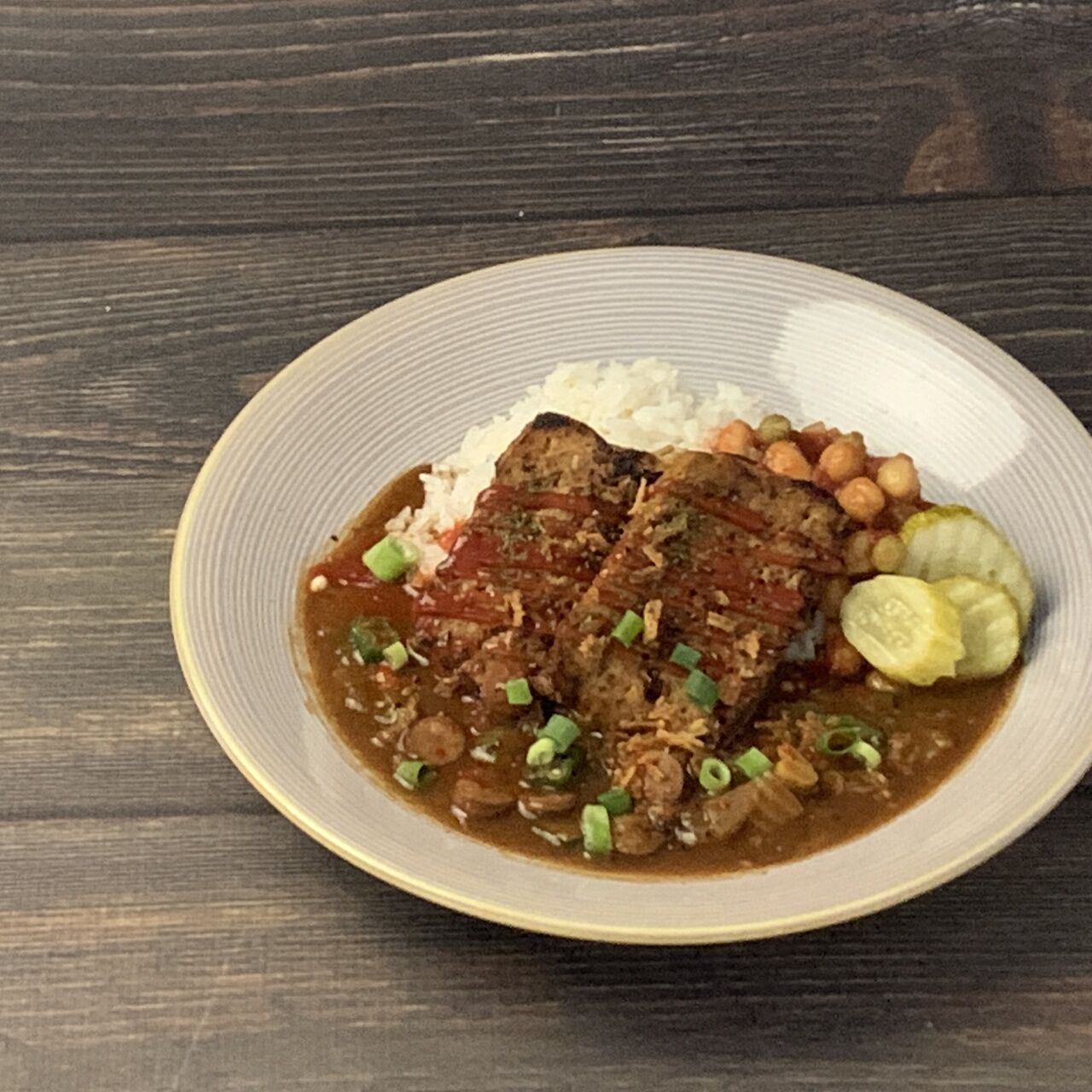 手捏ねの柔らかミートローフ。ガンボとの相性もバツグンです。