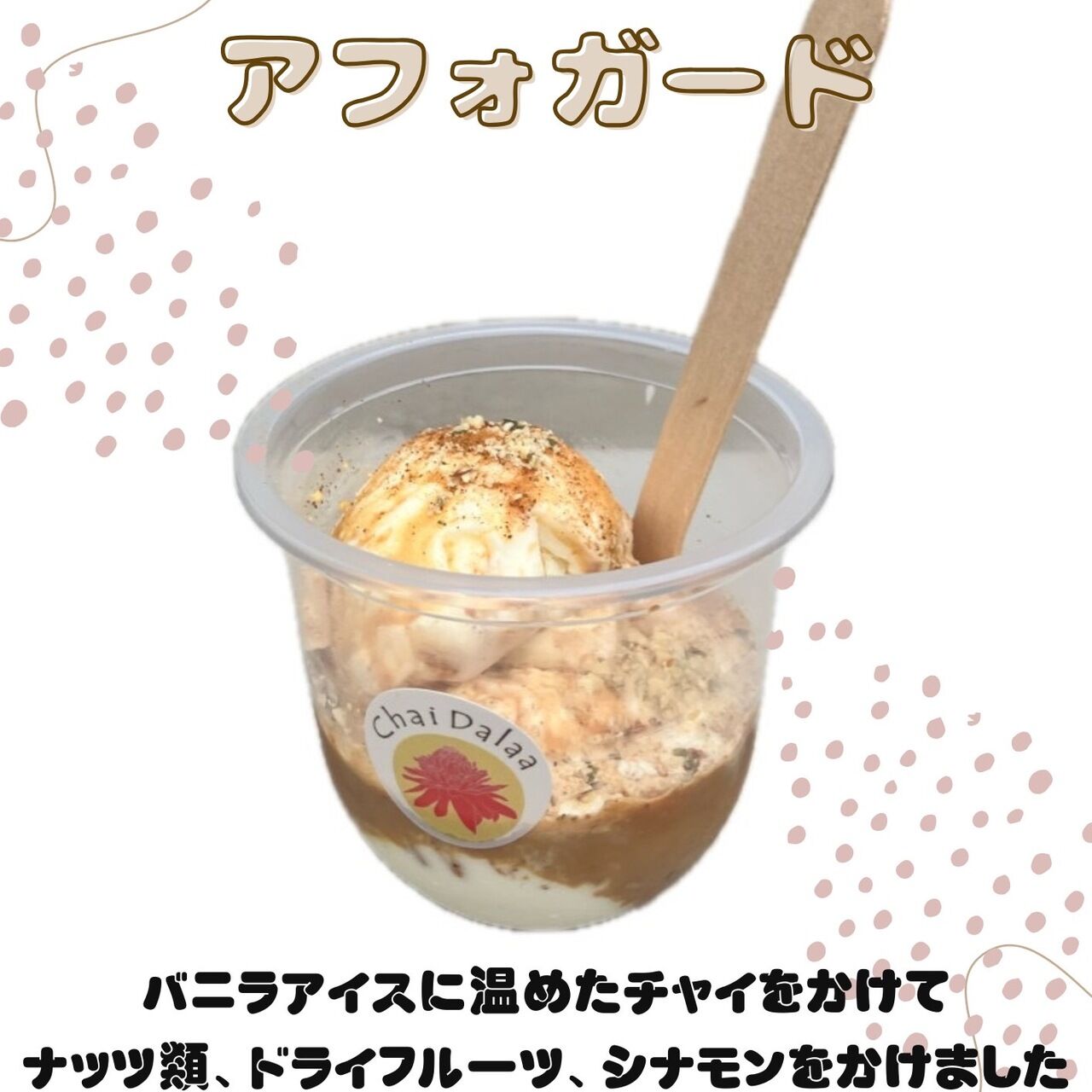 バニラアイスに温めたチャイをかけて、ナッツ類・ドライフルーツ・シナモンパウダーをふりかけました。 やさしい甘さで美味しいです♡