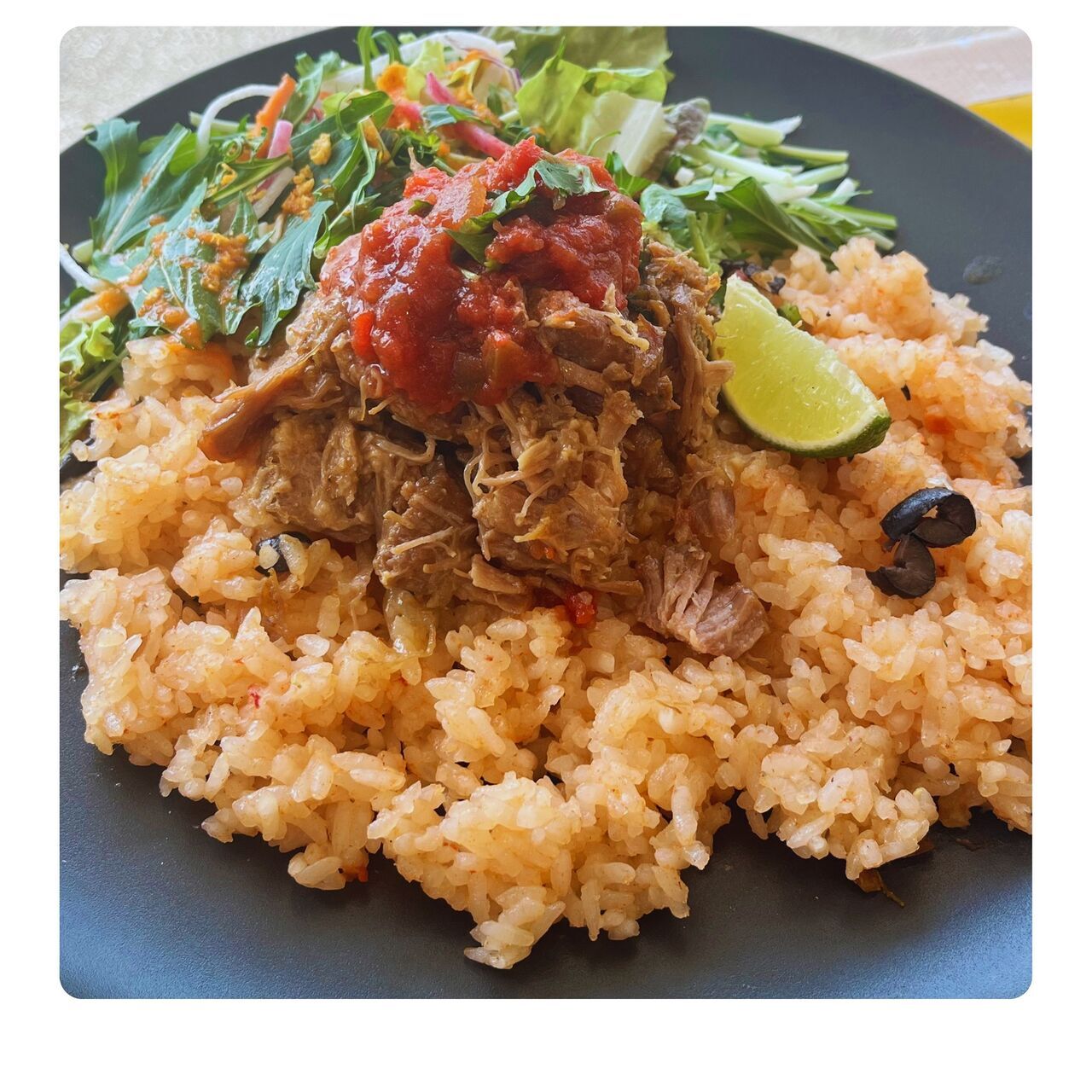メキシコ料理店では定番のスパニッシュライスに当店自慢の三元豚肩ロースを煮込んだカルニタスをOn*メインをタンドリーチキンに変更できます