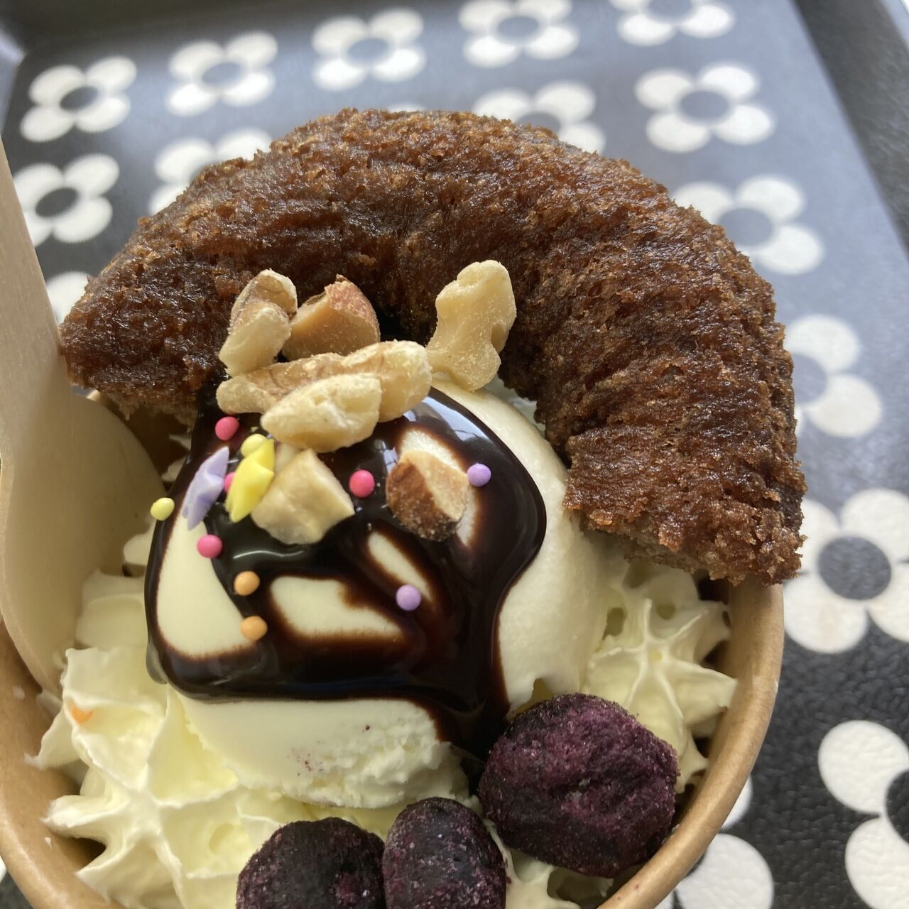 ドーナツにアイスやナッツ、フルーツなどをトッピングしたかわいいパフェ