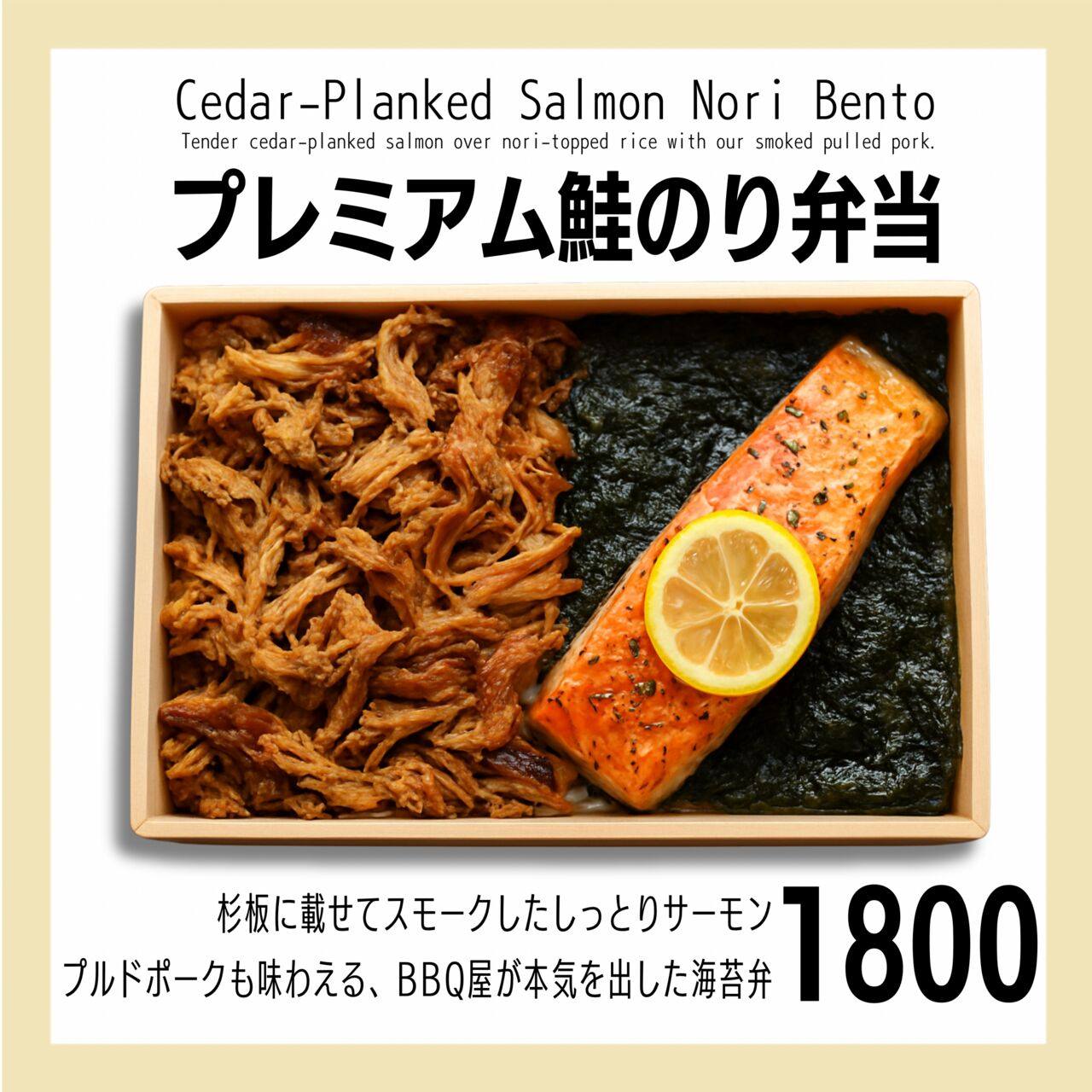BBQ屋が本気で作ったら鮭弁はこうなる。水分をたっぷり含ませた杉板に厚切り鮭を乗せてスモーク!しっとりで香り豊かです。プルドポークも一緒に!
