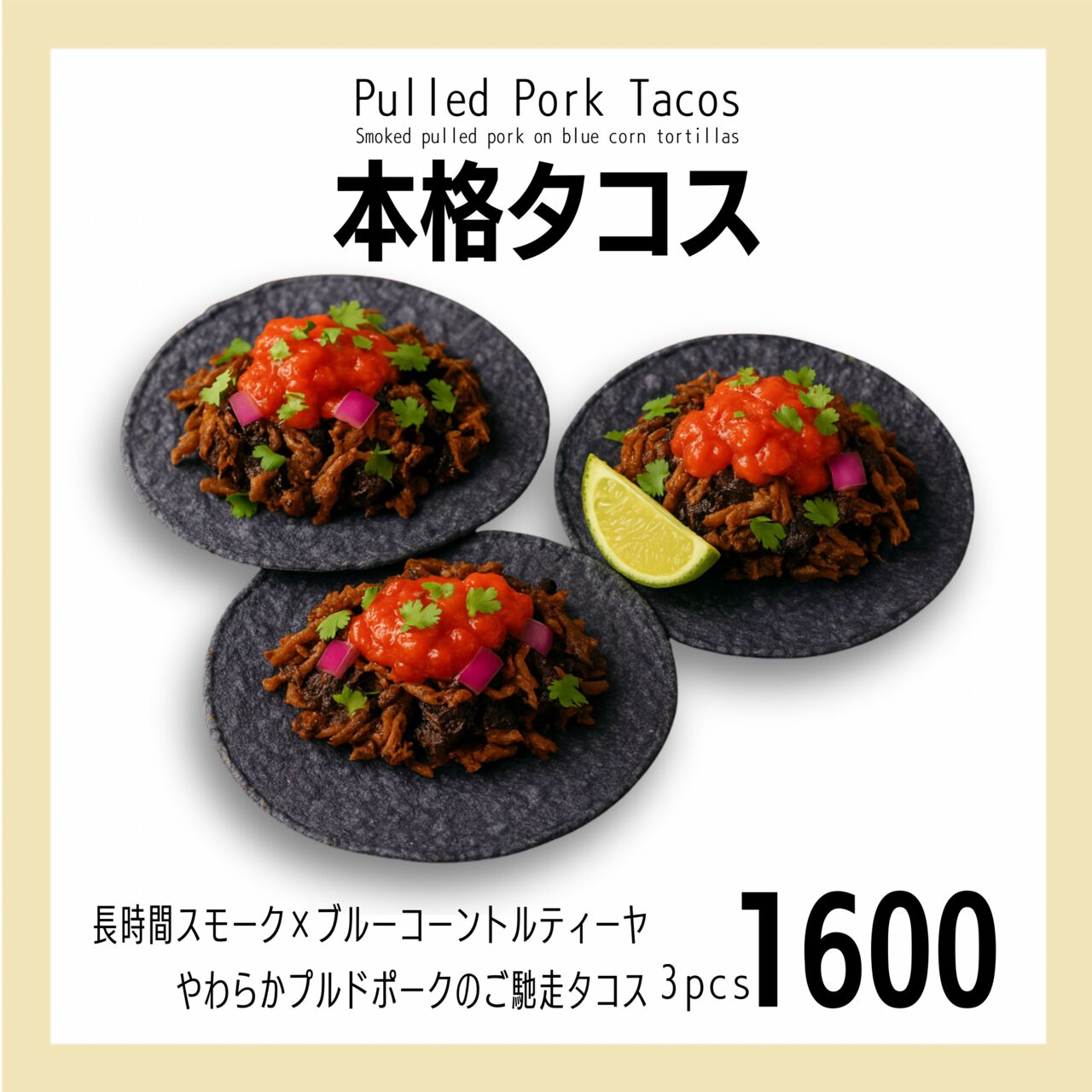 3pcs 飲めるBBQポークxポリフェノールたっぷりのブルーコーントルティーヤ。オフィスでは13時から販売開始です。