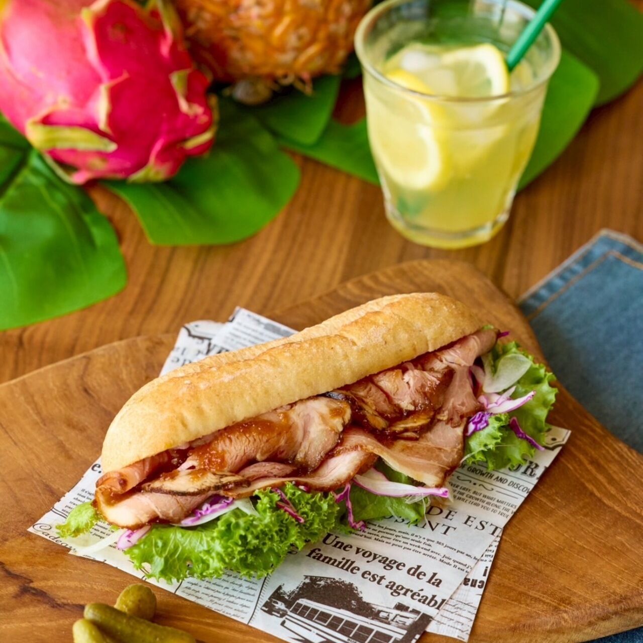 ローストポークを季節野菜と一緒にサンドしたガッツリワンハンドフード。主にイベント限定の商品。