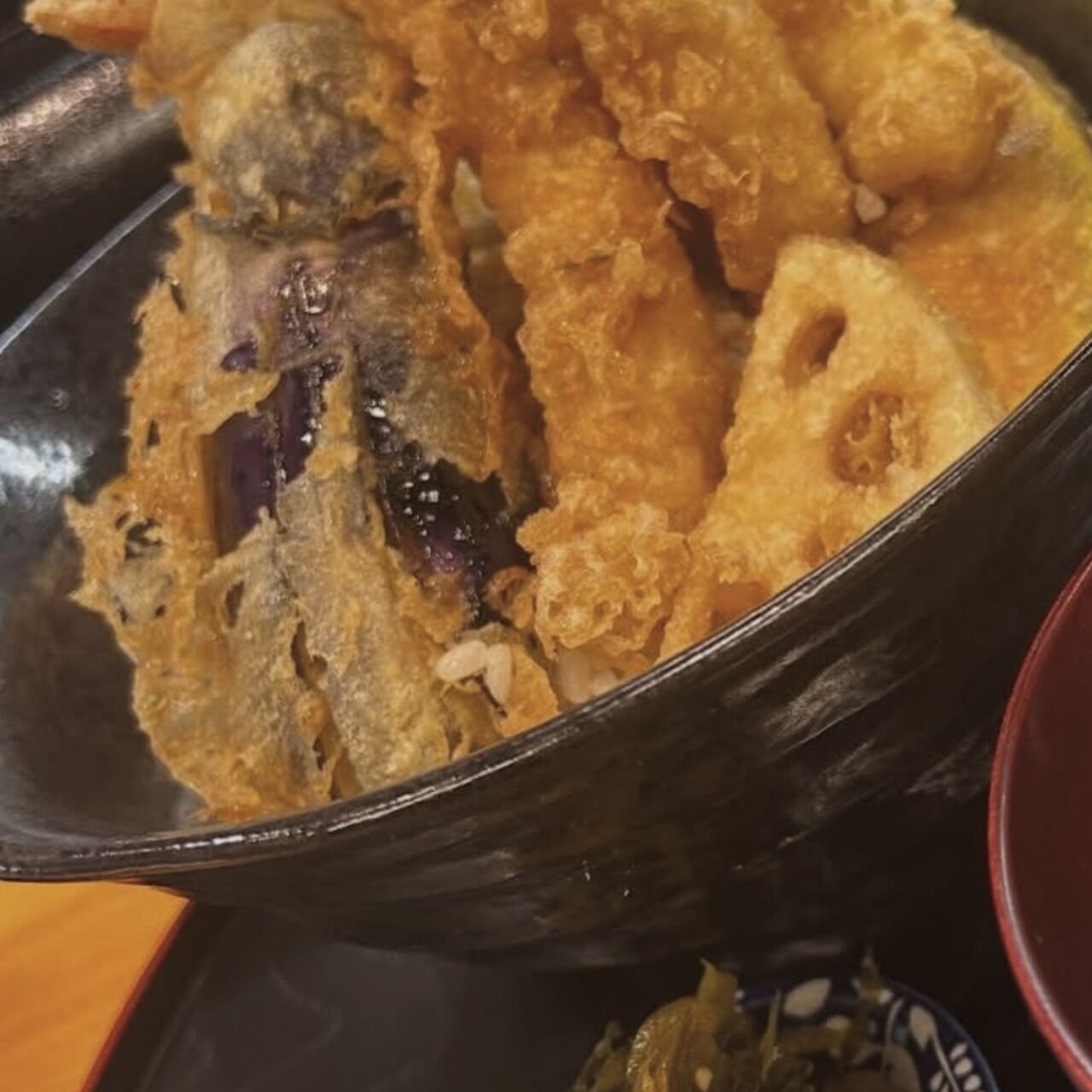 揚げたての天丼です。その日の野菜の仕入れ状況により内容が異なります。変わった野菜があるときも!?
