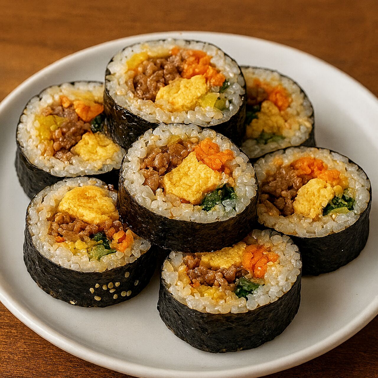 韓国風海苔巻き!豚肉をプルコギ風に炒め、少し甘めのだし巻き卵!鉄分栄養たっぷりの新鮮な小松菜、人参の甘みが入ったナムル食べごたえ抜群の海苔巻き!