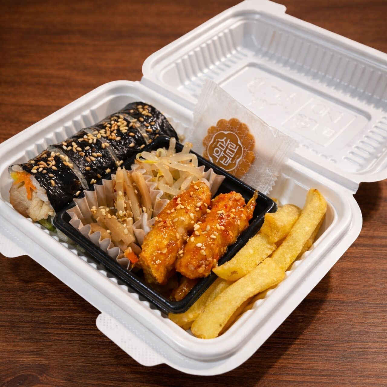 キンパと味が選べるチキン、特製のもやしのナムル、韓国風の蓮根のきんぴら、カリッとポテト、食後に韓国人気のヤッカが入ったオリジナルBOX!