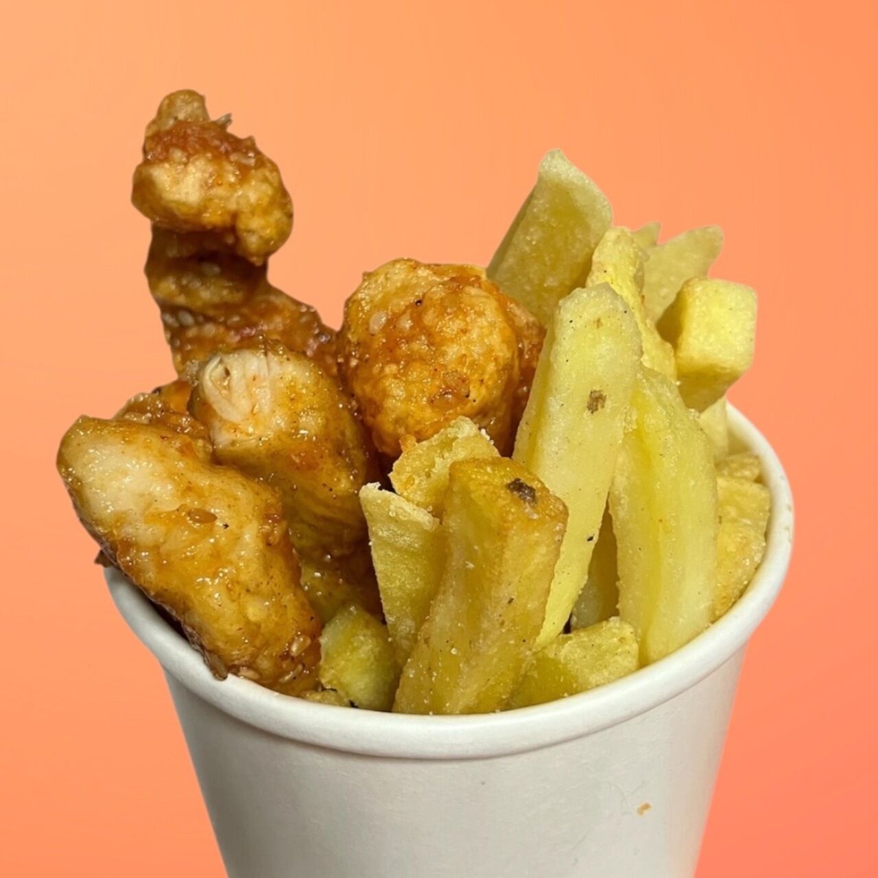 ヘルシーでタンパク質の鶏胸肉を添加物、防腐剤が一切入ってないコーン油で揚げ、特製の甘くてちょっぴり辛いタレを絡めた見た目も珍しいロングヤンニョンチキンです!