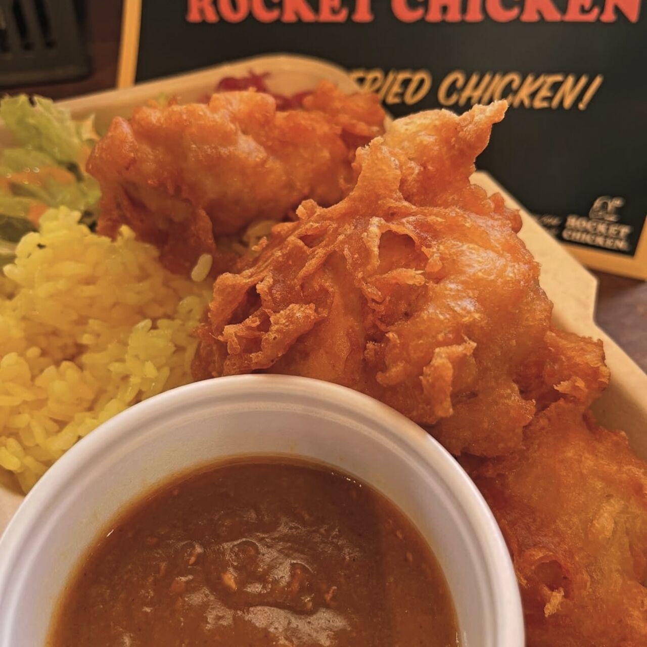 ロケットチキン、ターメリックライス、サラダがひとつになった