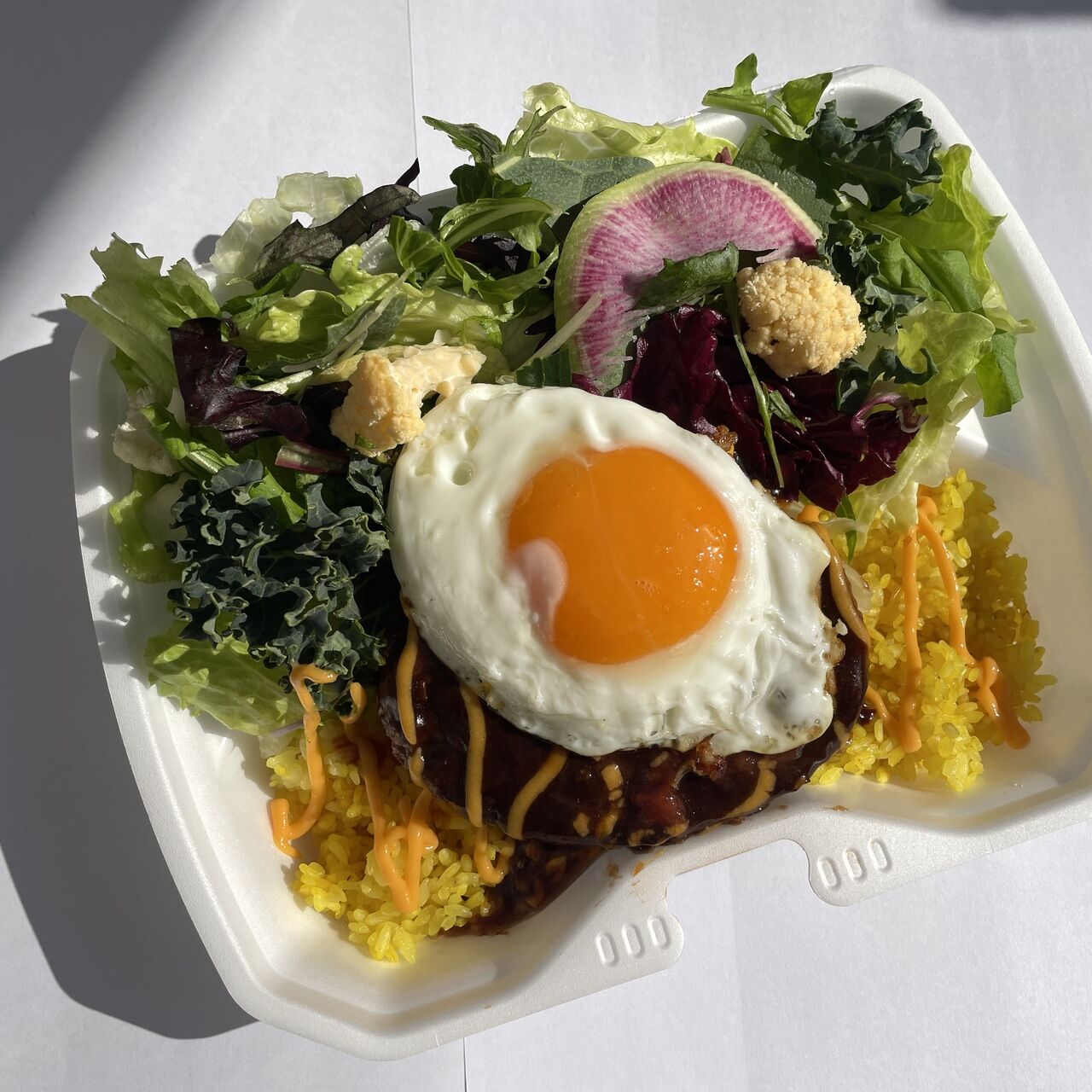 香ばしく焼いたハンバーグをオリジナルソースとお野菜でじっくり煮込見ました。セットのターメリックライスとサラダと一緒に召し上がれ。