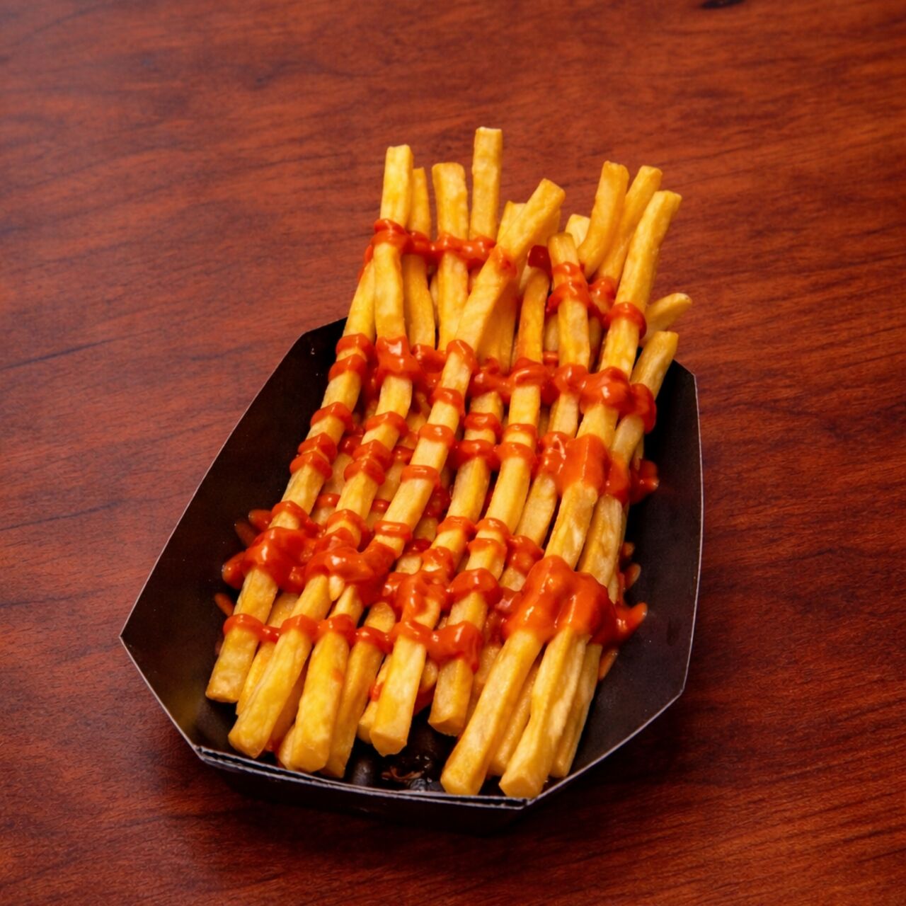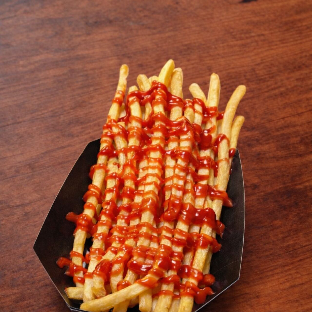 外はカリッと、中はホクホクのロングポテト。 定番のケチャップをトッピングした、シンプルで間違いない味。 ご注文ごとに揚げたてを提供します。