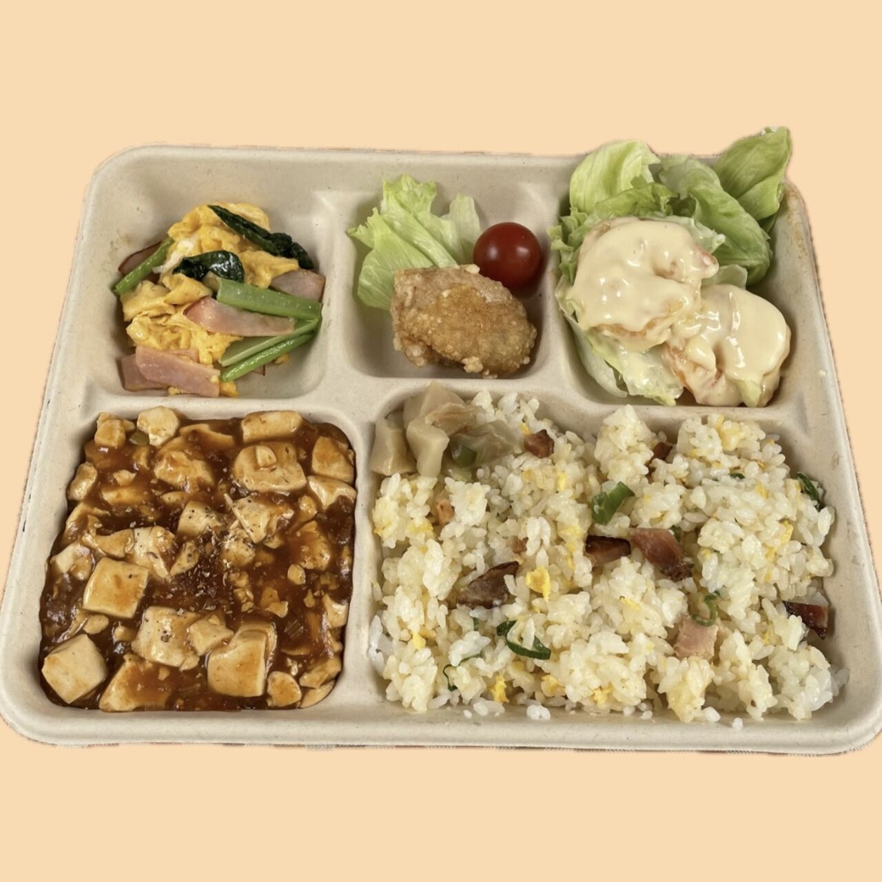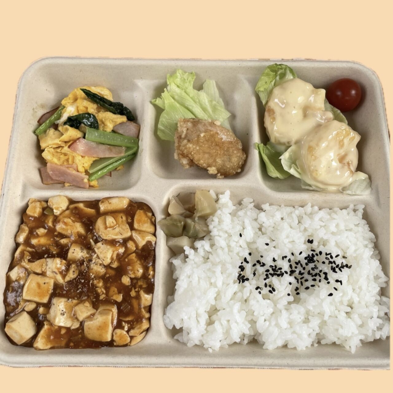 麻婆豆腐、エビマヨ、からあげ、日替わりの副菜がつきます!