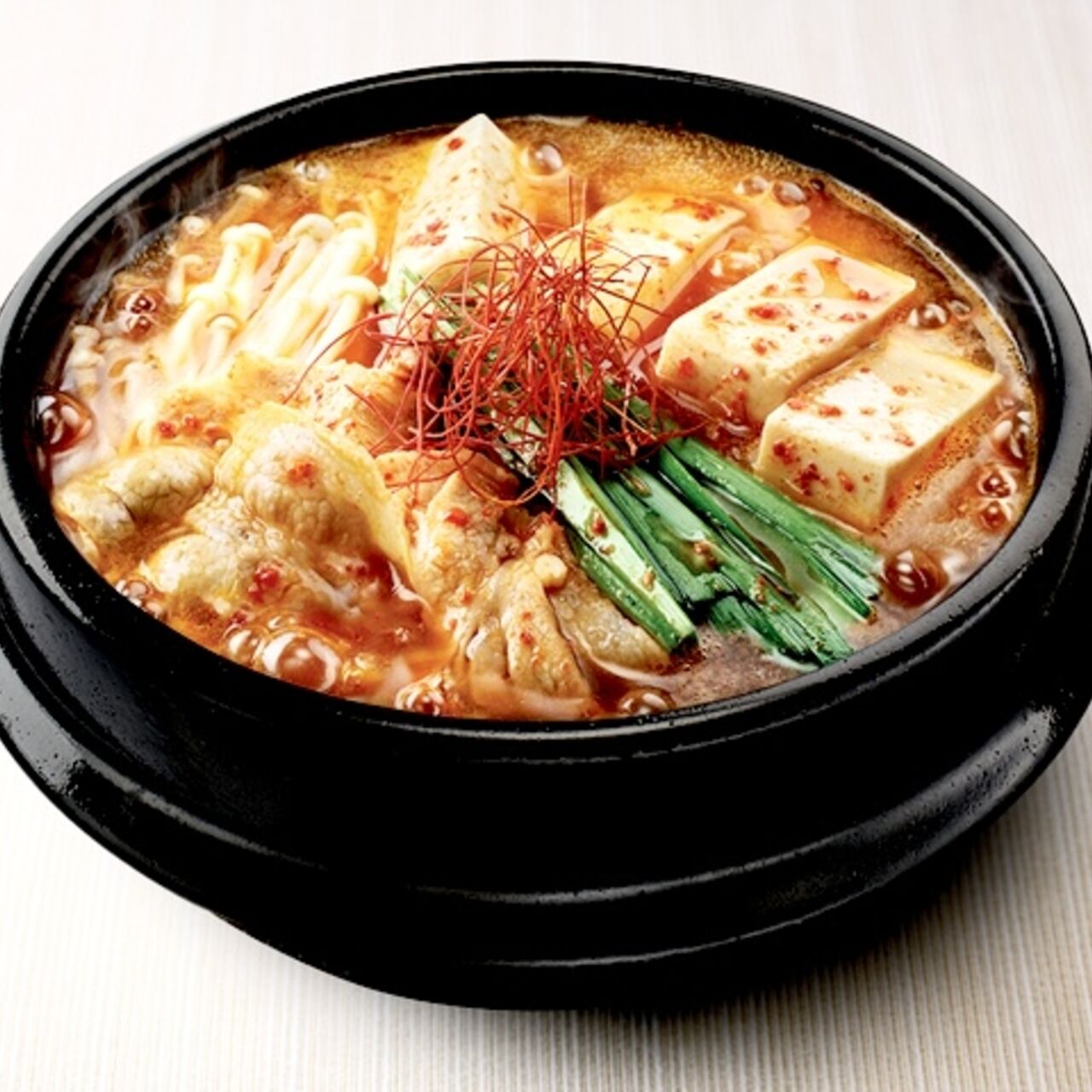 【奇数週のみ販売】カニ・アサリ・イカ・エビ等で丁寧に出汁を取り作るスンドゥブです。豆腐、アサリ、豚肉、日替わりお野菜が入っています。画像はイメージです。