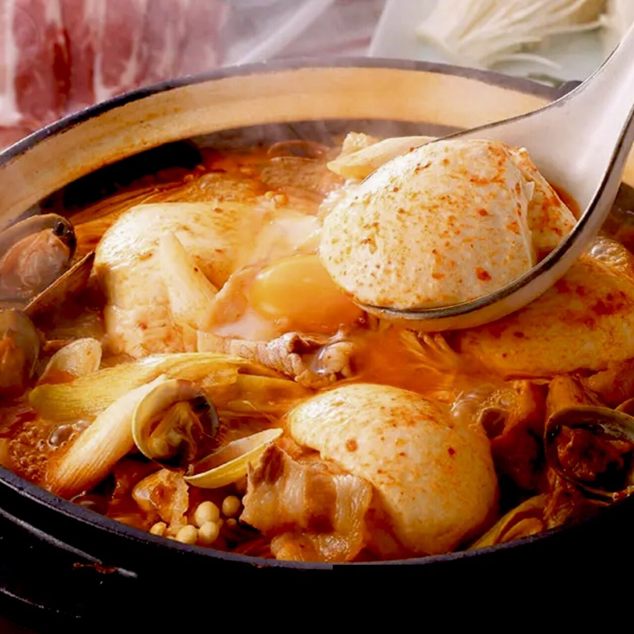 【奇数週のみ販売】小海老・イカを追加したプレミアムスンドゥブです。豆腐、アサリ、豚肉、日替わりお野菜入り。生卵の提供はしておりません。画像はイメージです。