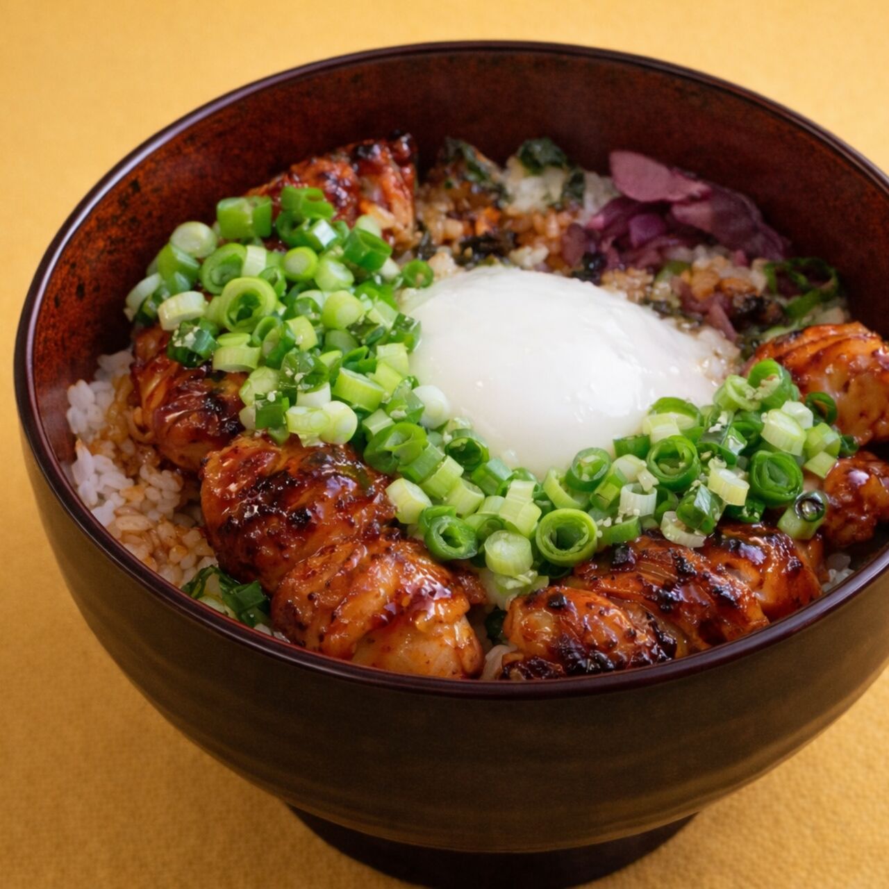 ふっくらジューシー鳥モモに秘伝のタレと温泉卵を絡めた御飯は病みつきになる事、間違い無い🤤