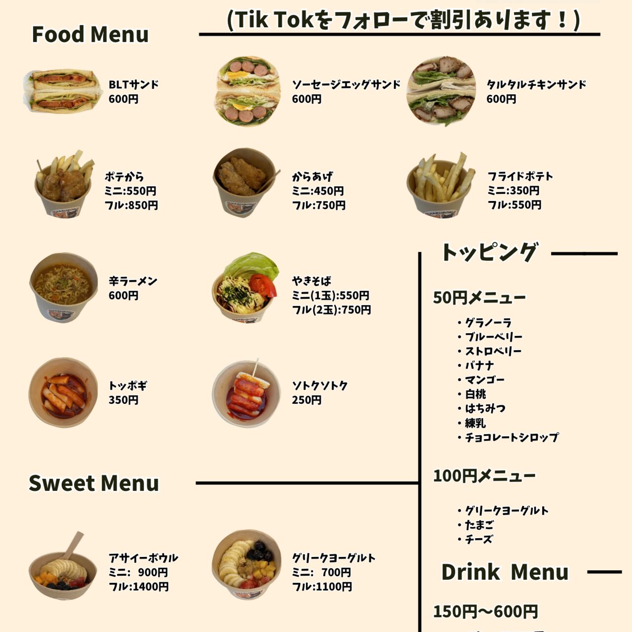 韓国料理ドリンク天ぷら・揚げ物スイーツお好み焼き・たこ焼き牛